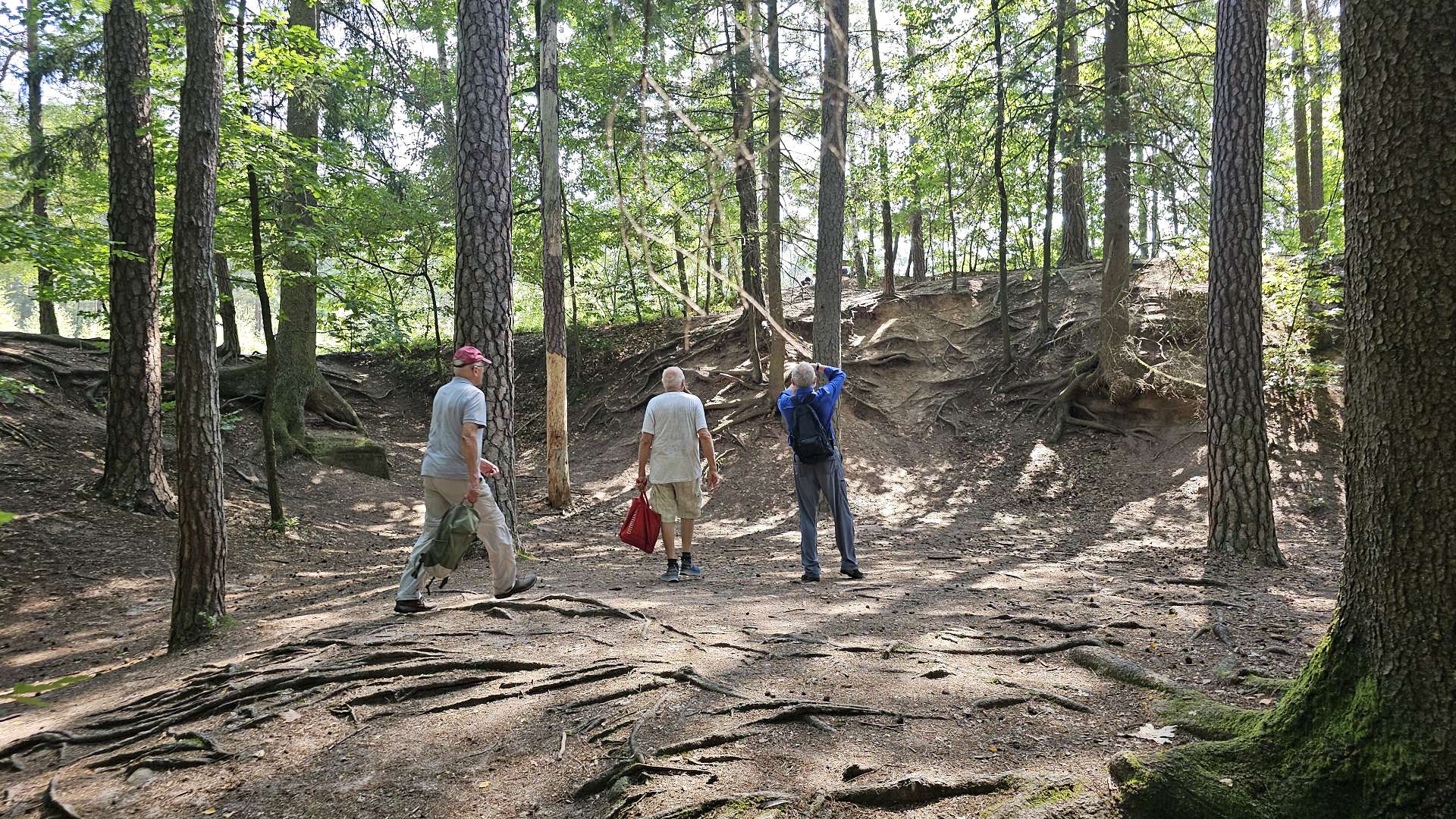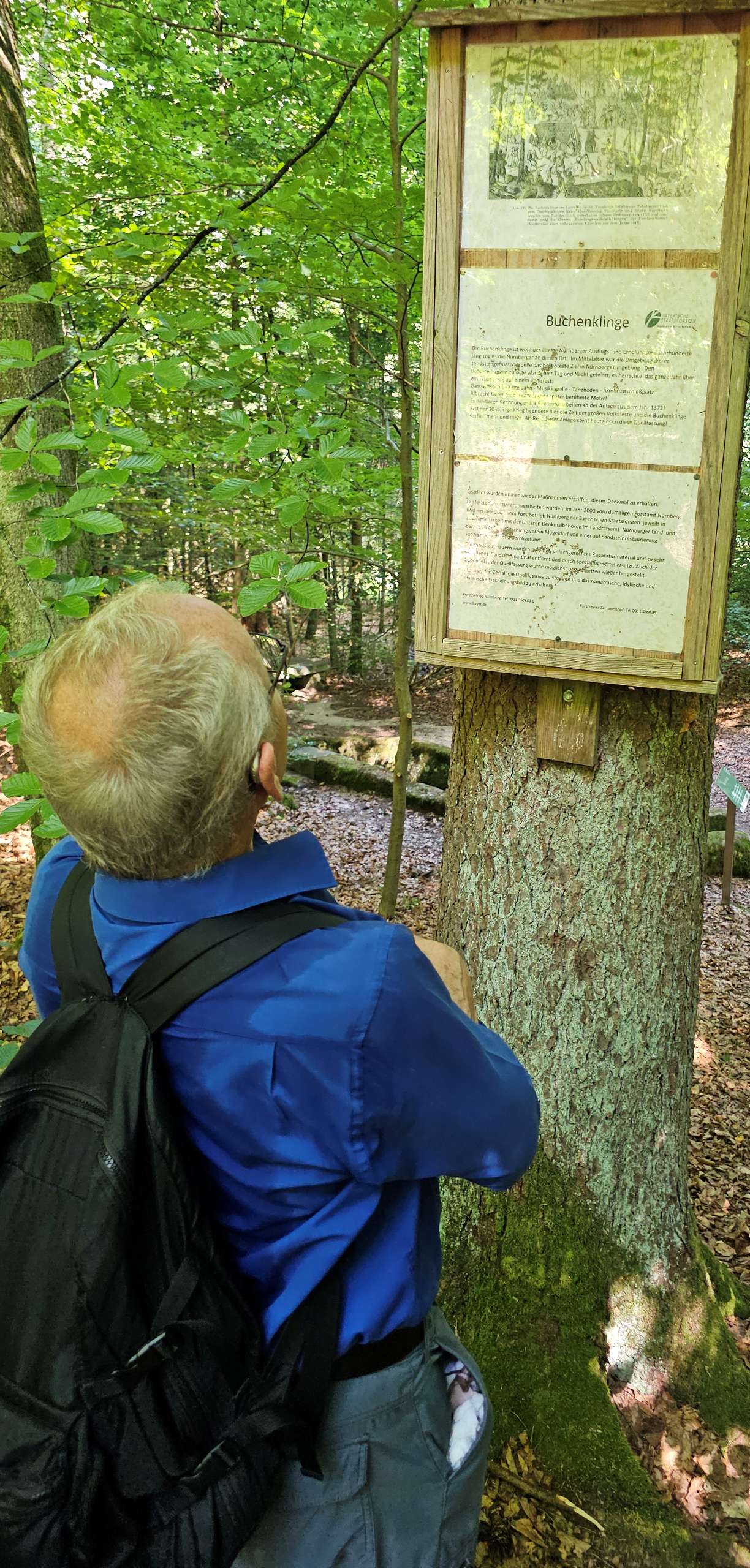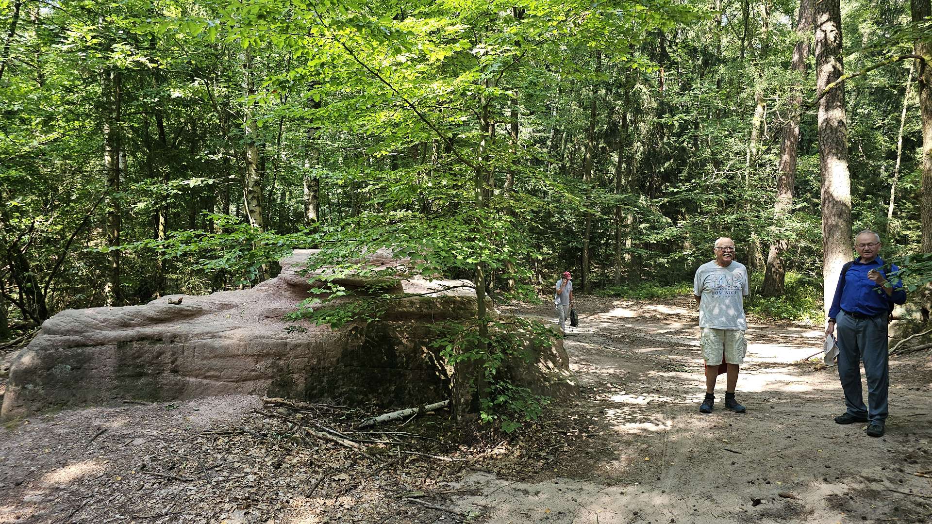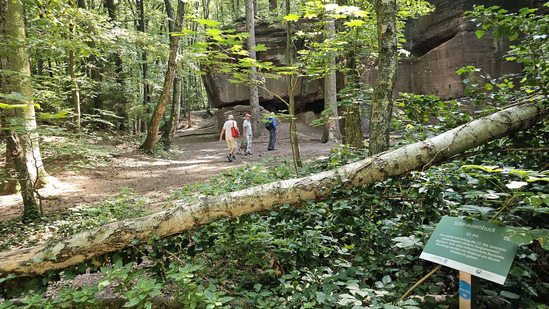 bergauf - es heißt ja nicht umsonst Schmausen...buck(el). Der Rückweg ist fast etwas eintönig im Vergleich zum abwechslungsreichen ersten Teil der Wanderung. Am Sandweg kann man der Sonne ausweichen, indem man auf dem schönen Pfad rechts neben dem Fahrweg läuft. Da es mittlerweile über 30°C (im durch die Laubbäume schon abgekühlten Schatten) hat, entschließen wir uns, das Stück durch die Schmausenbuckstraße, zum Gasthof "Schöne Aussicht", mit der Straßenbahn zu fahren. Nachdem wir gut griechisch