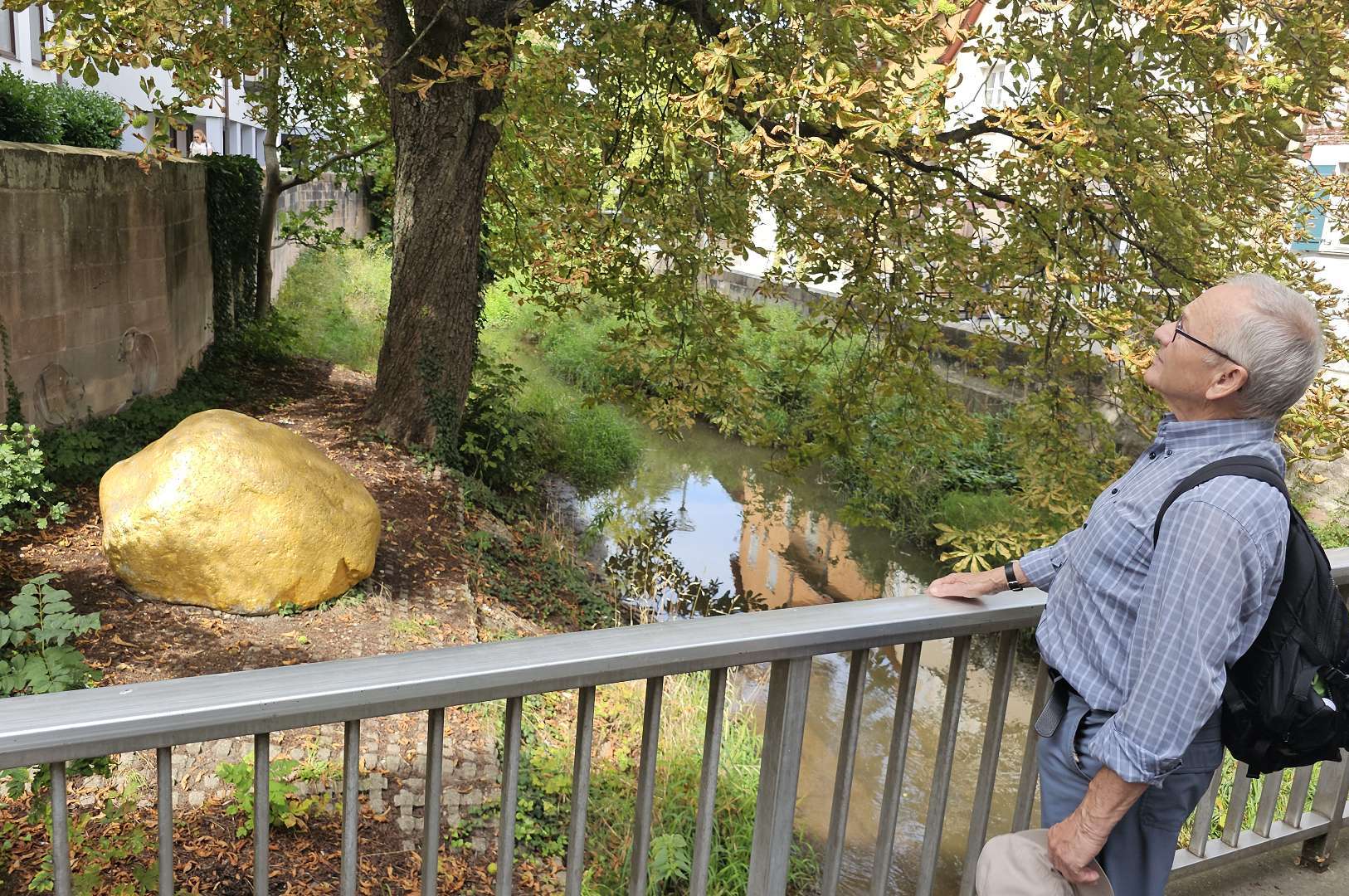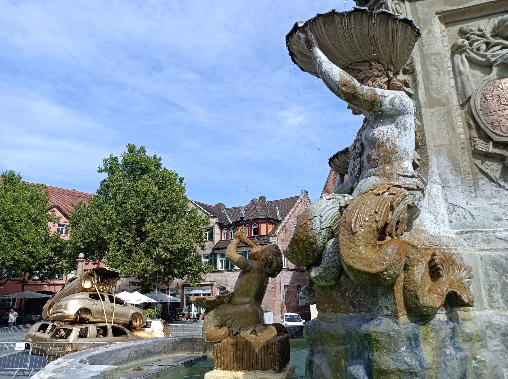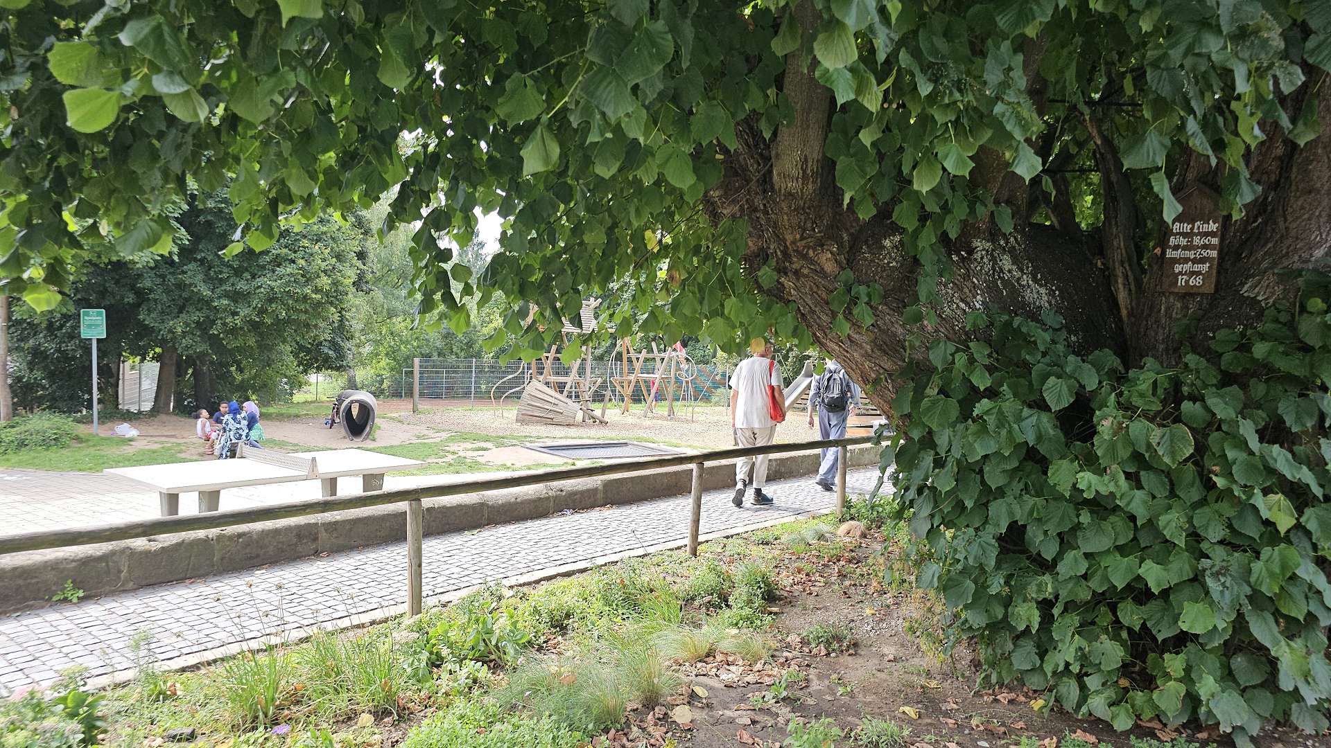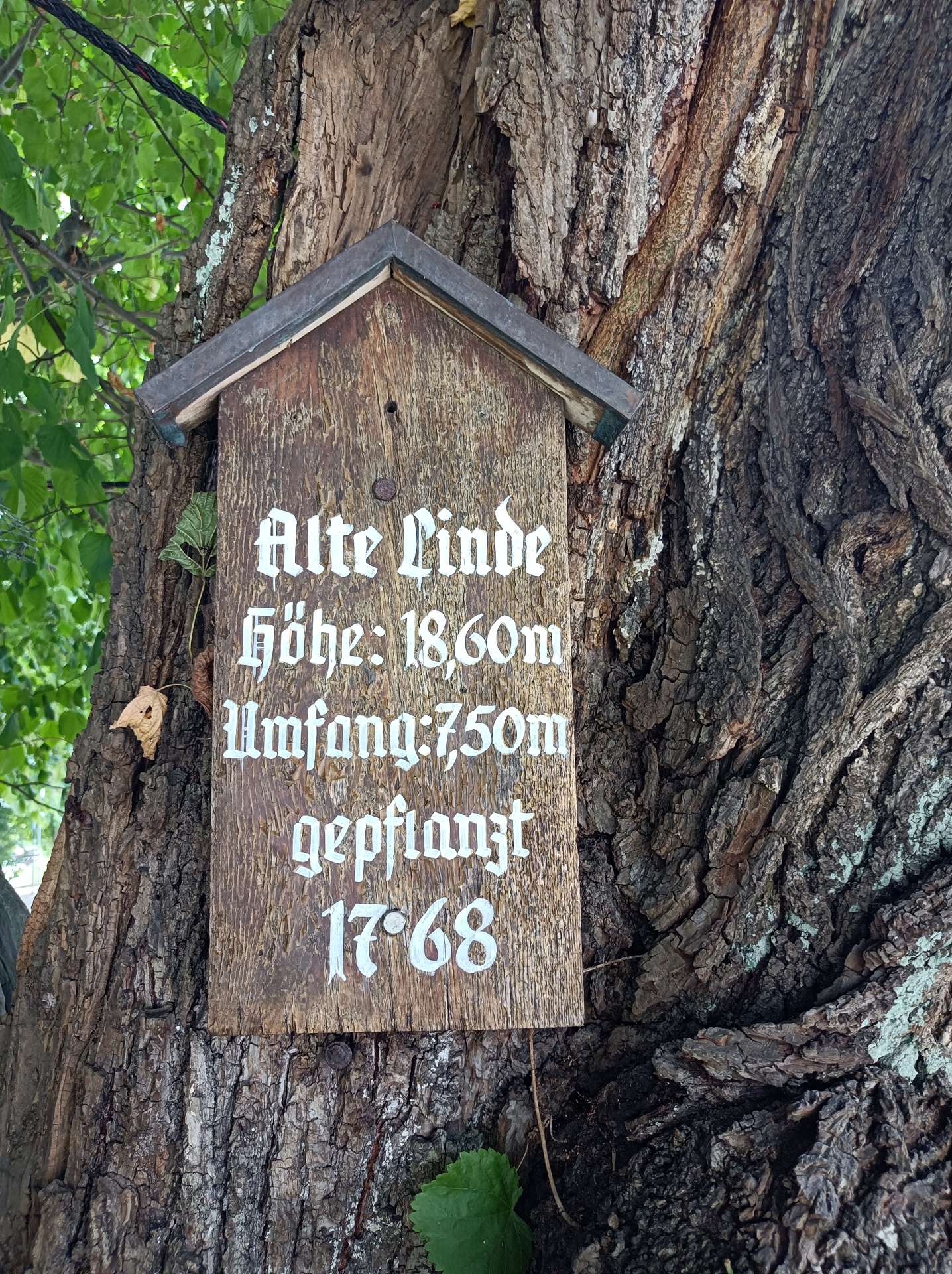 weiterzuentwickeln. Orientiert haben wir uns an diesem Plan und der Beschreibung dazu. Und ehrlicherweise muss gesagt werden, dass sich ein "kleiner Rundgang" auch für Banausen lohnt (s. Bilder); Schwabach ist ja auch ohne Ortung eine schöne Stadt. Wir starten, nach einer versehentlichen BusRundreise über Unterreichenbach, am Schillerplatz (Bus-Station Rathausplatz war gesperrt). Die ersten Stationen auf dem Weg zum Königsplatz sind noch nicht geöffnet, so ist unser erster Anlaufpunkt die Station 6 (goldenen Schrottautos) und dann die Martin-Luther-Kirche. Schon die allein ist einen Besuch wert und die Ausstellungsstücke darin gehören (mit dem Sinn! der Beschreibung) zu den Sehenswerteren. Dann geht es vorbei an der Tatze "zum gpldenen Stein" zur Station 28 und 20 (an der haben wir gar nicht gefunden), dann zur Station 26 und 21, an der die Umgebung (Häuser und Bach) den besten Eindruck hinterlässt. Nach ca. einer 3/4-Stunde sind wir an der "Alten Linde" Der markante Baum, nahe des Hördlertors an der Regelsbacher Straße/Badstraße, soll (laut Hinweistafel) 1768 gepflanzt worden sein. Fachleute schätzen das Alter allerdings beträchtlich höher ein. Man hat viel getan, um den imposante Baum zu erhalten: Zementplomben, Stahlstreben und um die Wurzeln wurden Drainagen gelegt, die Krone wurde radikal beschnitten. Der Jemmeritzer "1000-jährigen" Eiche hat das bekanntlich nicht gut getan, sie ist eingegangen. Dieser Baum zeigt, Gott sei Dank, eine außergewöhnliche Vitalität. Weiter geht es am