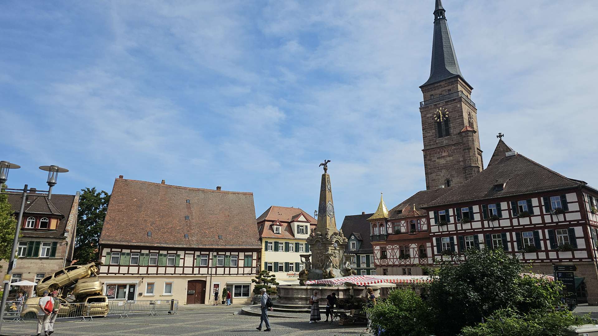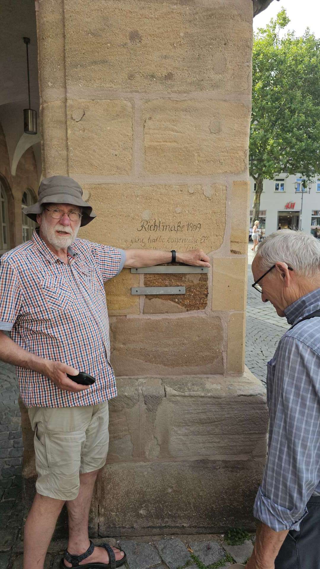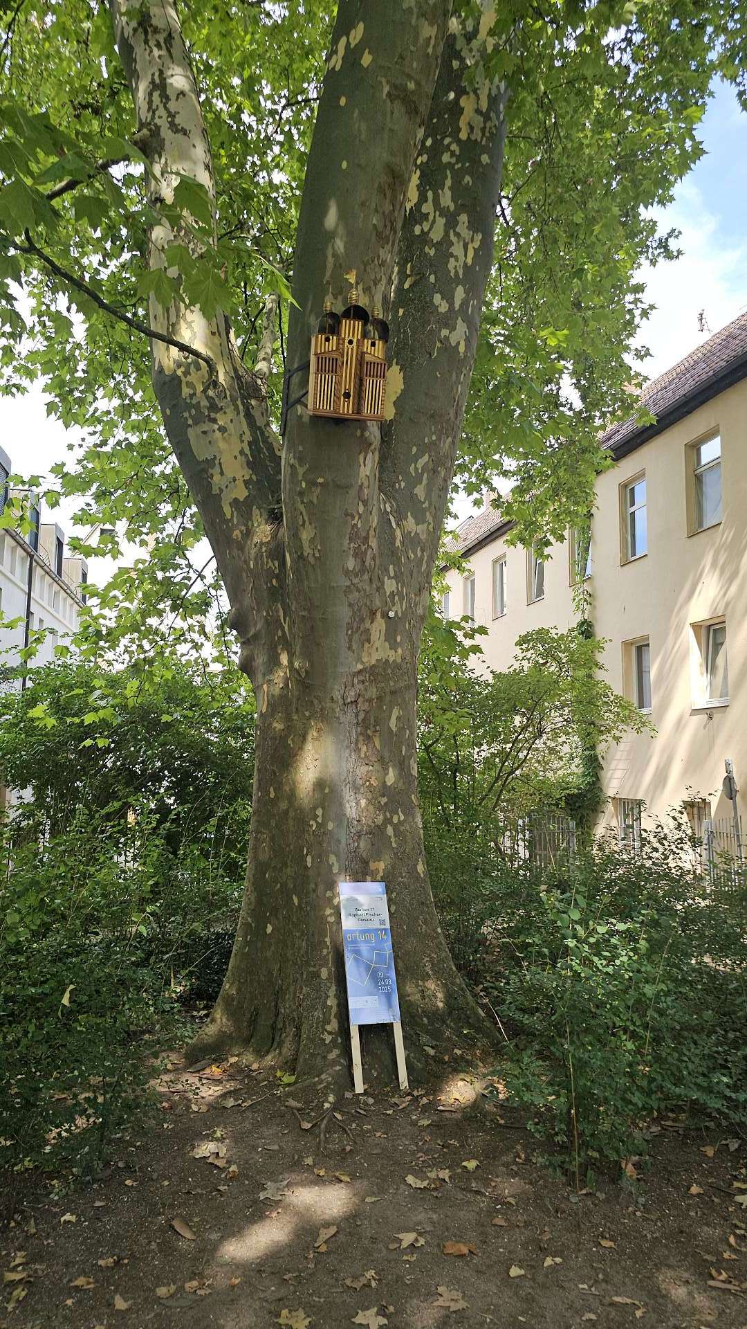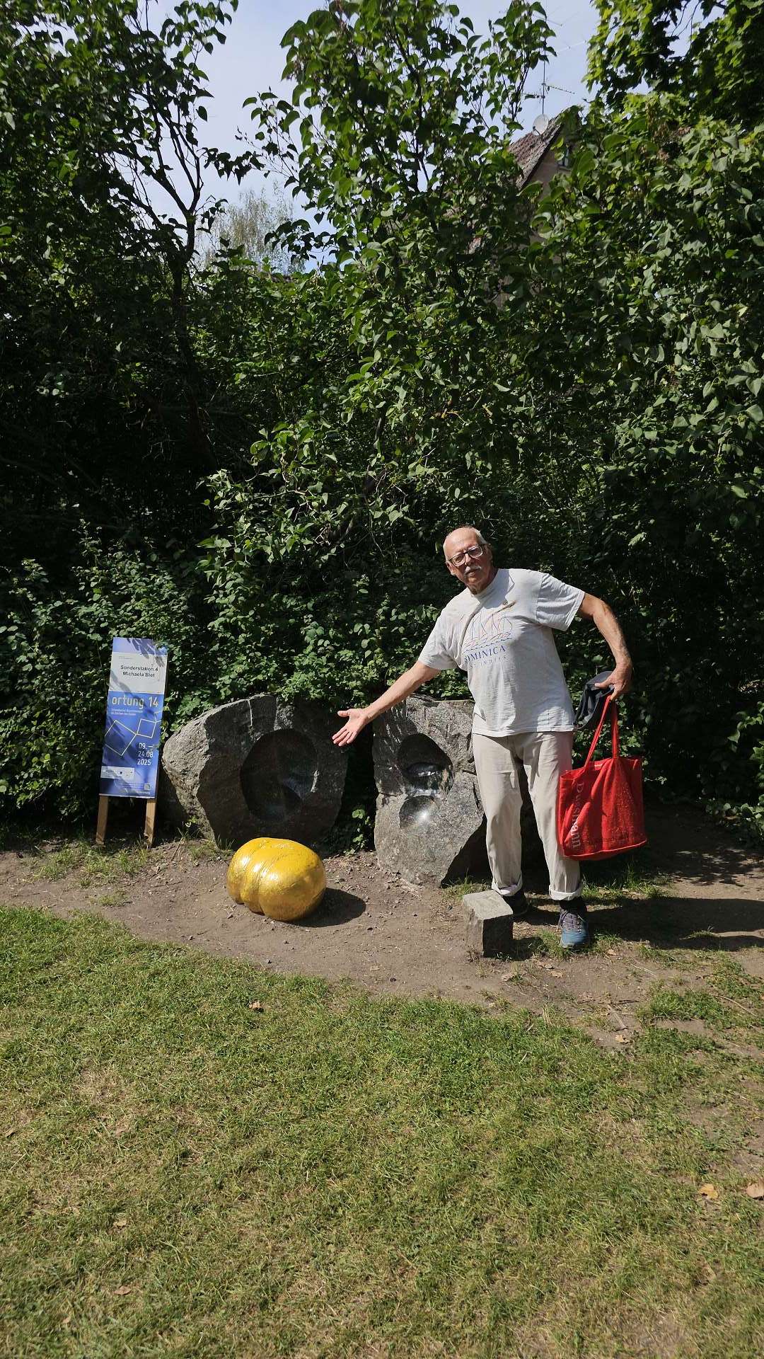 weiterzuentwickeln. Orientiert haben wir uns an diesem Plan und der Beschreibung dazu. Und ehrlicherweise muss gesagt werden, dass sich ein "kleiner Rundgang" auch für Banausen lohnt (s. Bilder); Schwabach ist ja auch ohne Ortung eine schöne Stadt. Wir starten, nach einer versehentlichen BusRundreise über Unterreichenbach, am Schillerplatz (Bus-Station Rathausplatz war gesperrt). Die ersten Stationen auf dem Weg zum Königsplatz sind noch nicht geöffnet, so ist unser erster Anlaufpunkt die Station 6 (goldenen Schrottautos) und dann die Martin-Luther-Kirche. Schon die allein ist einen Besuch wert und die Ausstellungsstücke darin gehören (mit dem Sinn! der Beschreibung) zu den Sehenswerteren. Dann geht es vorbei an der Tatze "zum gpldenen Stein" zur Station 28 und 20 (an der haben wir gar nicht gefunden), dann zur Station 26 und 21, an der die Umgebung (Häuser und Bach) den besten Eindruck hinterlässt. Nach ca. einer 3/4-Stunde sind wir an der "Alten Linde" Der markante Baum, nahe des Hördlertors an der Regelsbacher Straße/Badstraße, soll (laut Hinweistafel) 1768 gepflanzt worden sein. Fachleute schätzen das Alter allerdings beträchtlich höher ein. Man hat viel getan, um den imposante Baum zu erhalten: Zementplomben, Stahlstreben und um die Wurzeln wurden Drainagen gelegt, die Krone wurde radikal beschnitten. Der Jemmeritzer "1000-jährigen" Eiche hat das bekanntlich nicht gut getan, sie ist eingegangen. Dieser Baum zeigt, Gott sei Dank, eine außergewöhnliche Vitalität. Weiter geht es am