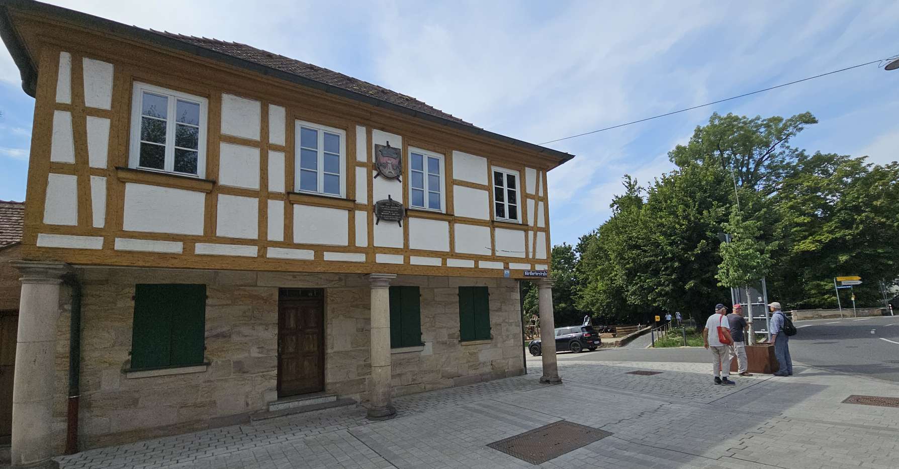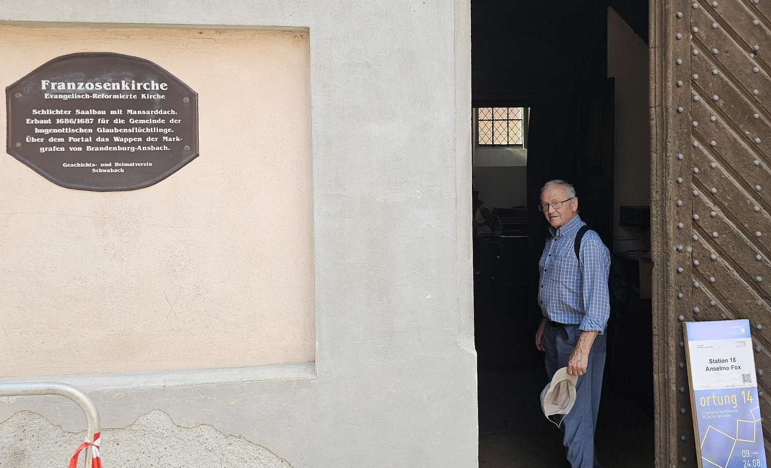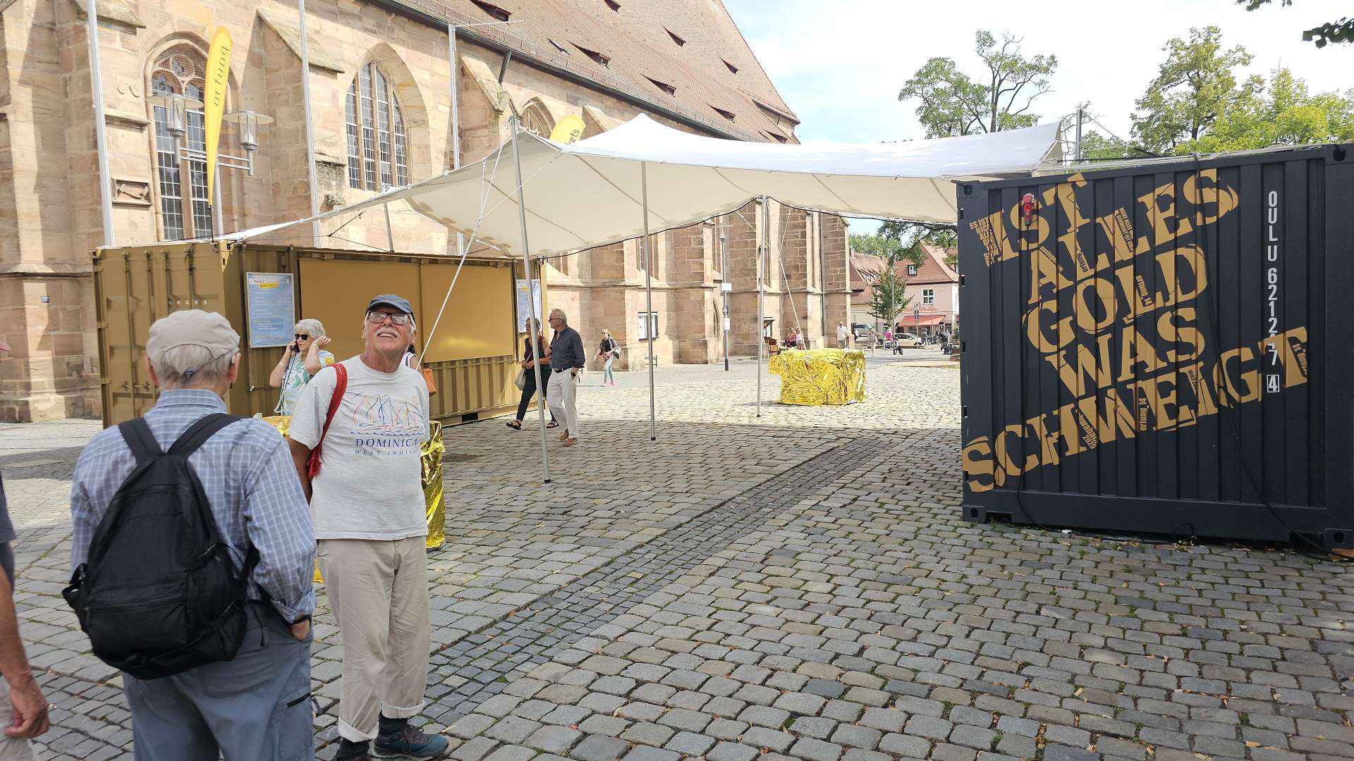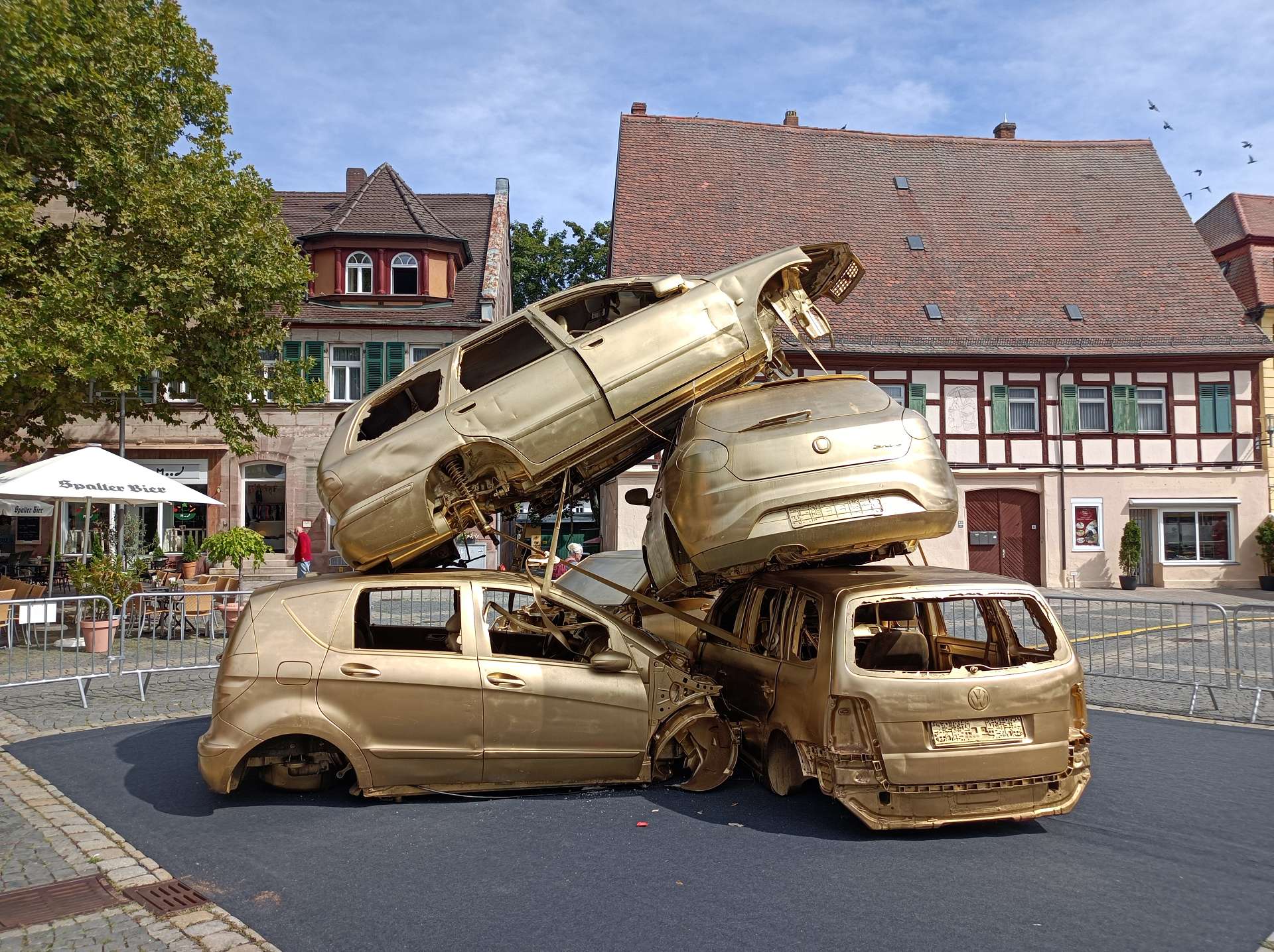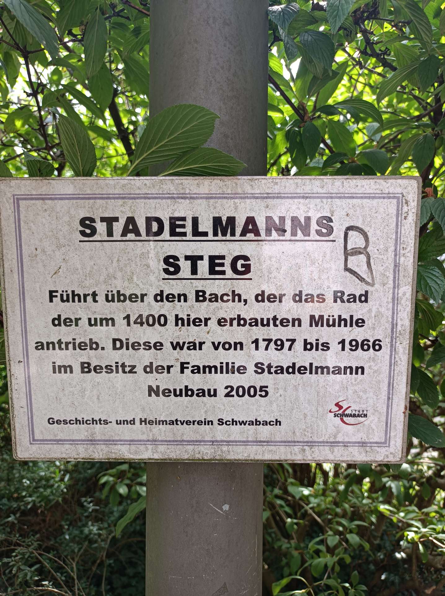 weiterzuentwickeln. Orientiert haben wir uns an diesem Plan und der Beschreibung dazu. Und ehrlicherweise muss gesagt werden, dass sich ein "kleiner Rundgang" auch für Banausen lohnt (s. Bilder); Schwabach ist ja auch ohne Ortung eine schöne Stadt. Wir starten, nach einer versehentlichen BusRundreise über Unterreichenbach, am Schillerplatz (Bus-Station Rathausplatz war gesperrt). Die ersten Stationen auf dem Weg zum Königsplatz sind noch nicht geöffnet, so ist unser erster Anlaufpunkt die Station 6 (goldenen Schrottautos) und dann die Martin-Luther-Kirche. Schon die allein ist einen Besuch wert und die Ausstellungsstücke darin gehören (mit dem Sinn! der Beschreibung) zu den Sehenswerteren. Dann geht es vorbei an der Tatze "zum gpldenen Stein" zur Station 28 und 20 (an der haben wir gar nicht gefunden), dann zur Station 26 und 21, an der die Umgebung (Häuser und Bach) den besten Eindruck hinterlässt. Nach ca. einer 3/4-Stunde sind wir an der "Alten Linde" Der markante Baum, nahe des Hördlertors an der Regelsbacher Straße/Badstraße, soll (laut Hinweistafel) 1768 gepflanzt worden sein. Fachleute schätzen das Alter allerdings beträchtlich höher ein. Man hat viel getan, um den imposante Baum zu erhalten: Zementplomben, Stahlstreben und um die Wurzeln wurden Drainagen gelegt, die Krone wurde radikal beschnitten. Der Jemmeritzer "1000-jährigen" Eiche hat das bekanntlich nicht gut getan, sie ist eingegangen. Dieser Baum zeigt, Gott sei Dank, eine außergewöhnliche Vitalität. Weiter geht es am