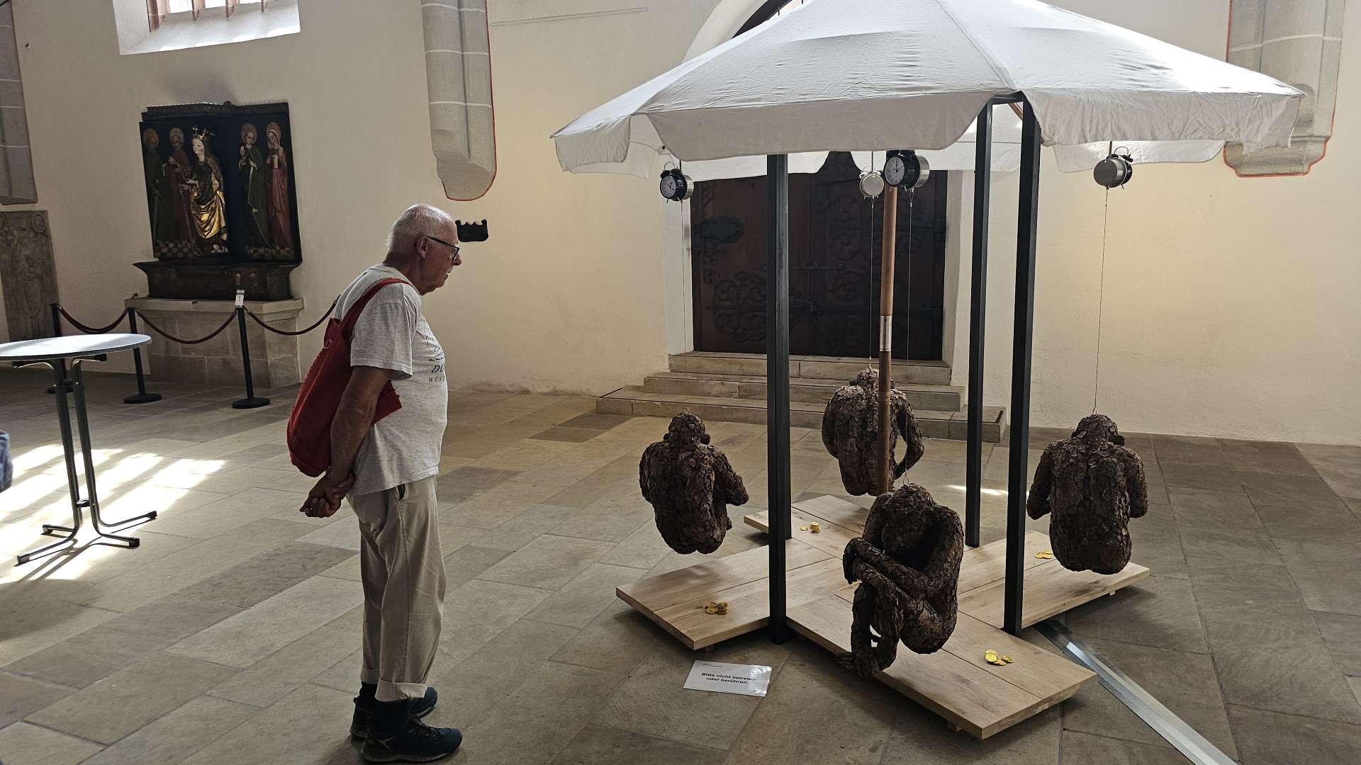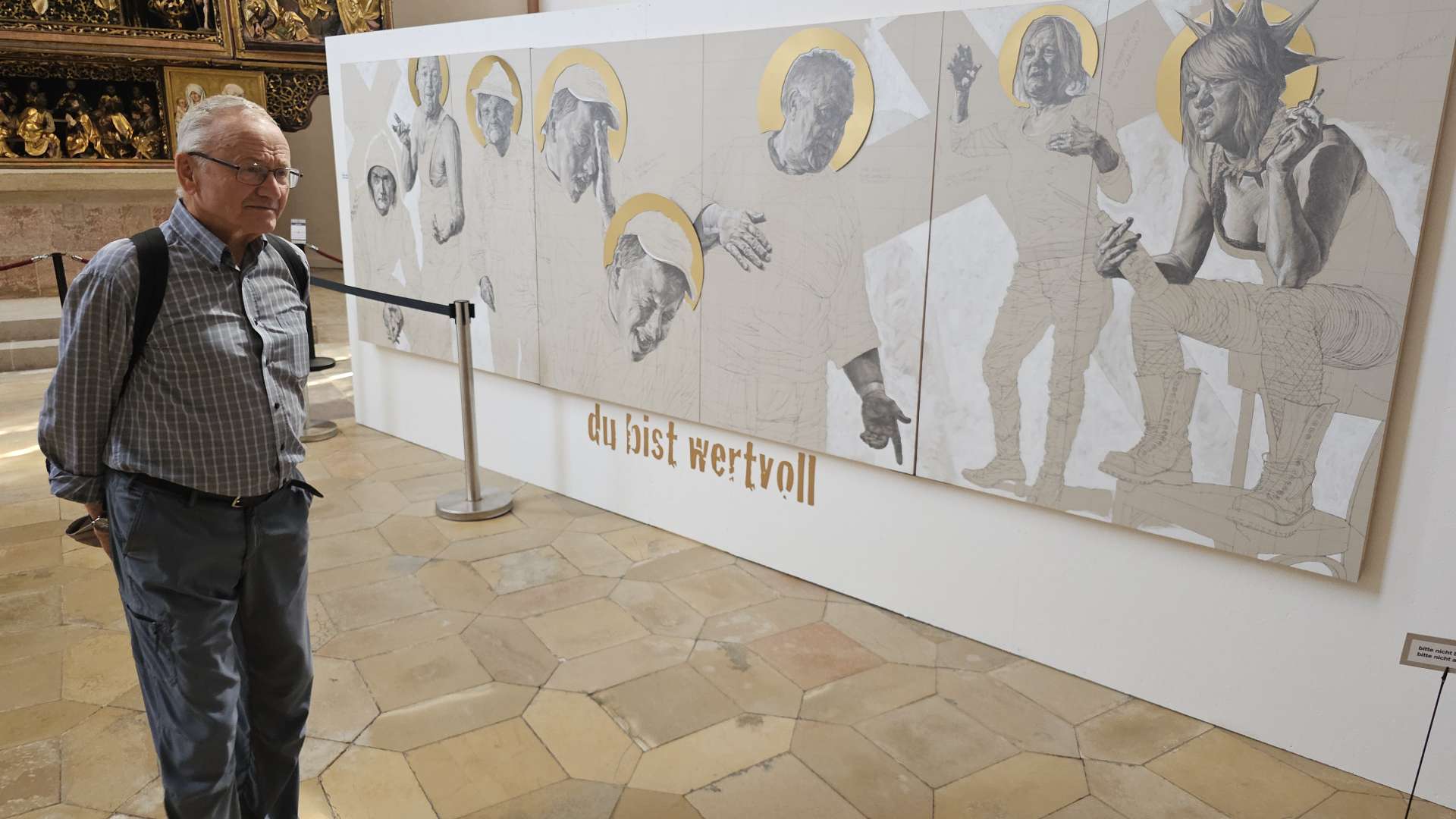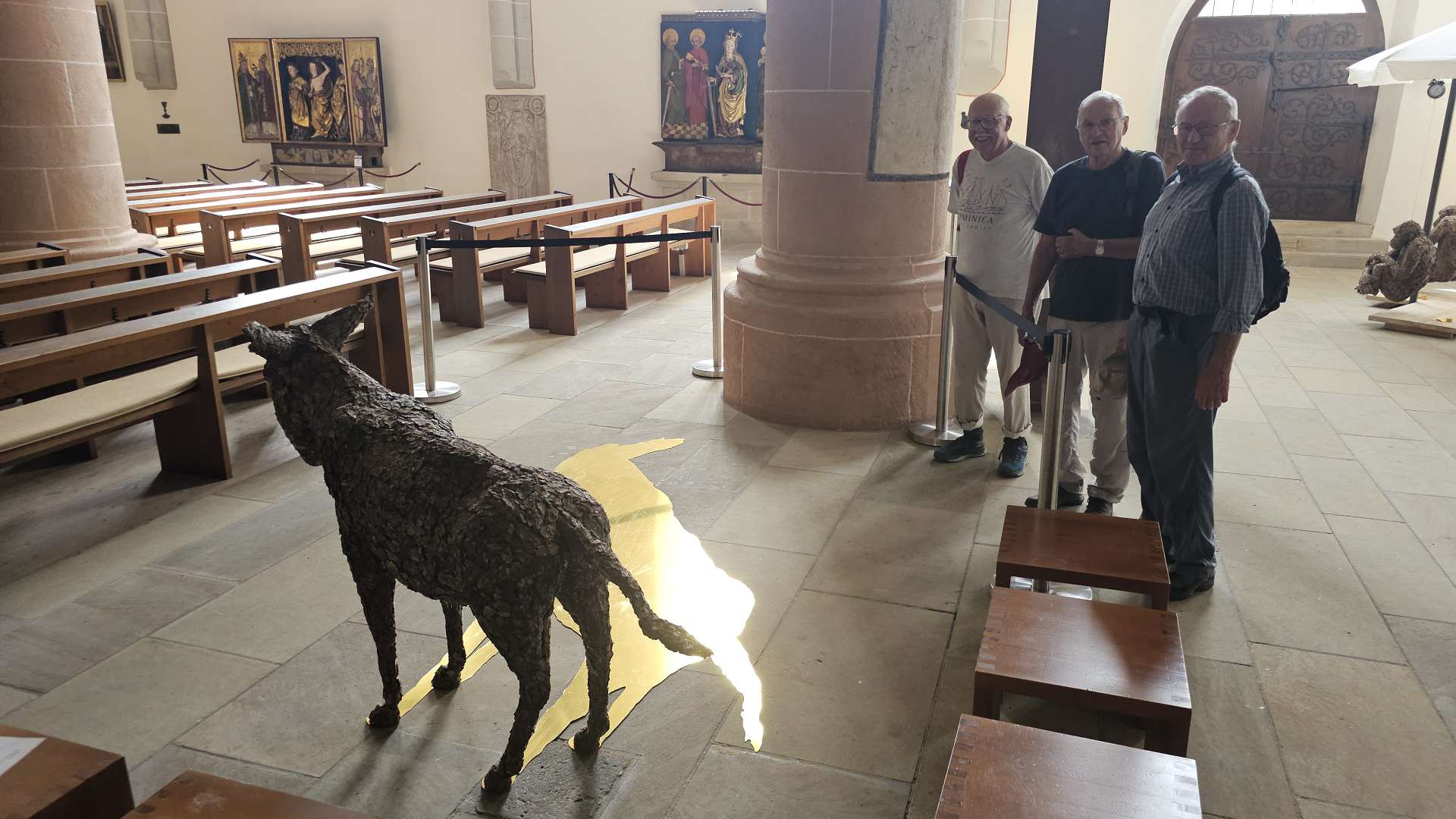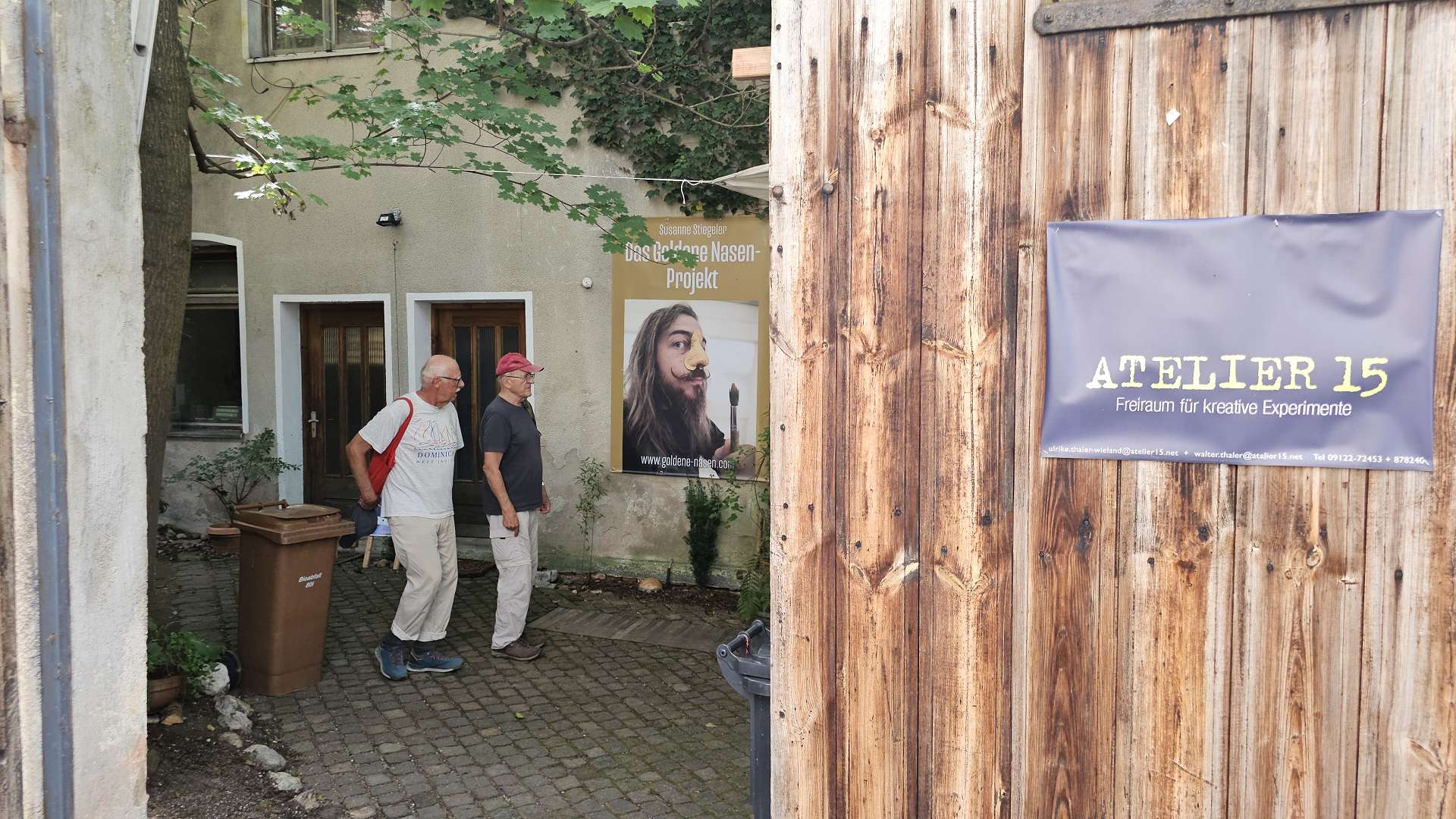 weiterzuentwickeln. Orientiert haben wir uns an diesem Plan und der Beschreibung dazu. Und ehrlicherweise muss gesagt werden, dass sich ein "kleiner Rundgang" auch für Banausen lohnt (s. Bilder); Schwabach ist ja auch ohne Ortung eine schöne Stadt. Wir starten, nach einer versehentlichen BusRundreise über Unterreichenbach, am Schillerplatz (Bus-Station Rathausplatz war gesperrt). Die ersten Stationen auf dem Weg zum Königsplatz sind noch nicht geöffnet, so ist unser erster Anlaufpunkt die Station 6 (goldenen Schrottautos) und dann die Martin-Luther-Kirche. Schon die allein ist einen Besuch wert und die Ausstellungsstücke darin gehören (mit dem Sinn! der Beschreibung) zu den Sehenswerteren. Dann geht es vorbei an der Tatze "zum gpldenen Stein" zur Station 28 und 20 (an der haben wir gar nicht gefunden), dann zur Station 26 und 21, an der die Umgebung (Häuser und Bach) den besten Eindruck hinterlässt. Nach ca. einer 3/4-Stunde sind wir an der "Alten Linde" Der markante Baum, nahe des Hördlertors an der Regelsbacher Straße/Badstraße, soll (laut Hinweistafel) 1768 gepflanzt worden sein. Fachleute schätzen das Alter allerdings beträchtlich höher ein. Man hat viel getan, um den imposante Baum zu erhalten: Zementplomben, Stahlstreben und um die Wurzeln wurden Drainagen gelegt, die Krone wurde radikal beschnitten. Der Jemmeritzer "1000-jährigen" Eiche hat das bekanntlich nicht gut getan, sie ist eingegangen. Dieser Baum zeigt, Gott sei Dank, eine außergewöhnliche Vitalität. Weiter geht es am