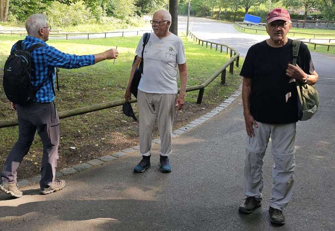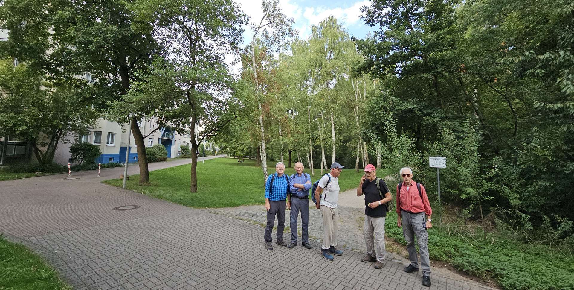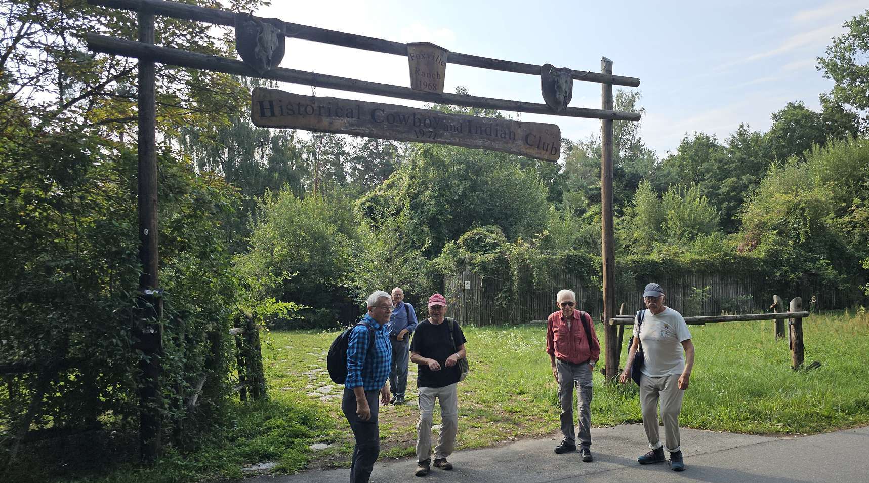 Nach einem kurzen Stück Weg neben grünen Wiesen, Büschen und Bäumen kann man einen Abstecher zu einem "historischen Cowboy. und Indianerclub" machen. Das Gelände ist leider verwildert und wird vermutlich zur Vermeidung kultureller Aneignung nicht mehr gepflegt☻. Gleich darauf folgt ein kurzes Stück (Karl-Schönleben-) Straße, dann ein längeres Stück Laubwald, bevor wir auf die "Große Straße" stoßen. Wir überqueren sie zwischen Messegelände und Parkhaus und sind schon wieder in "grüner Umgebung". Leider muss uns Henry hier verlassen