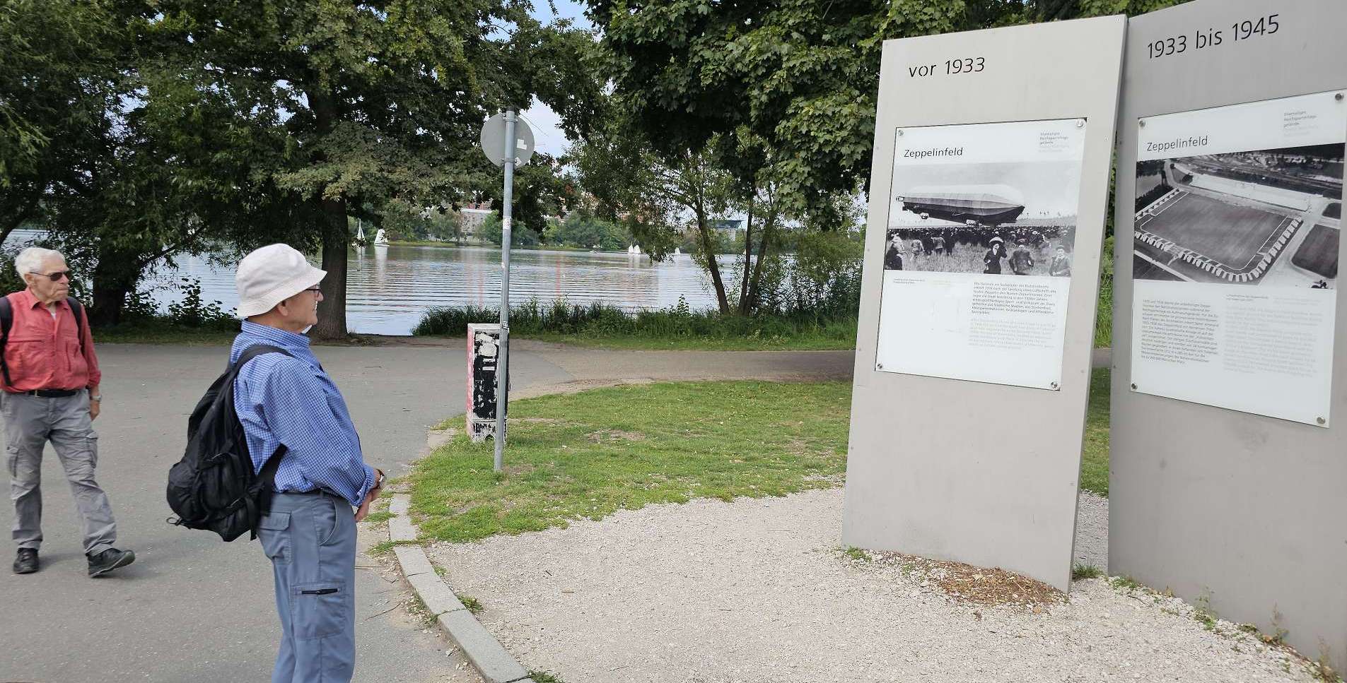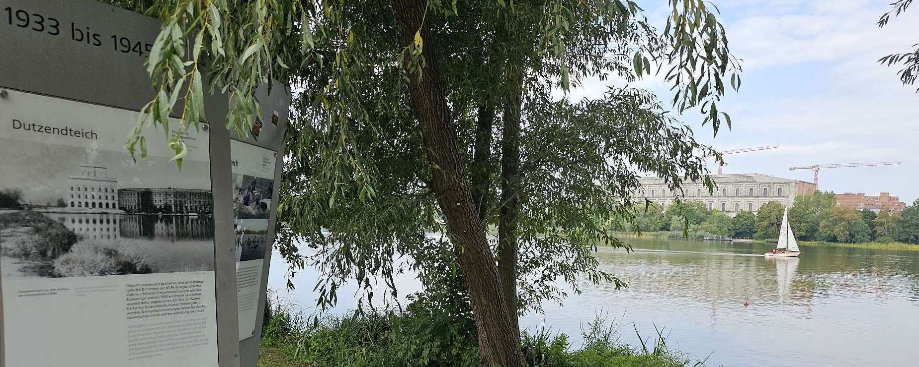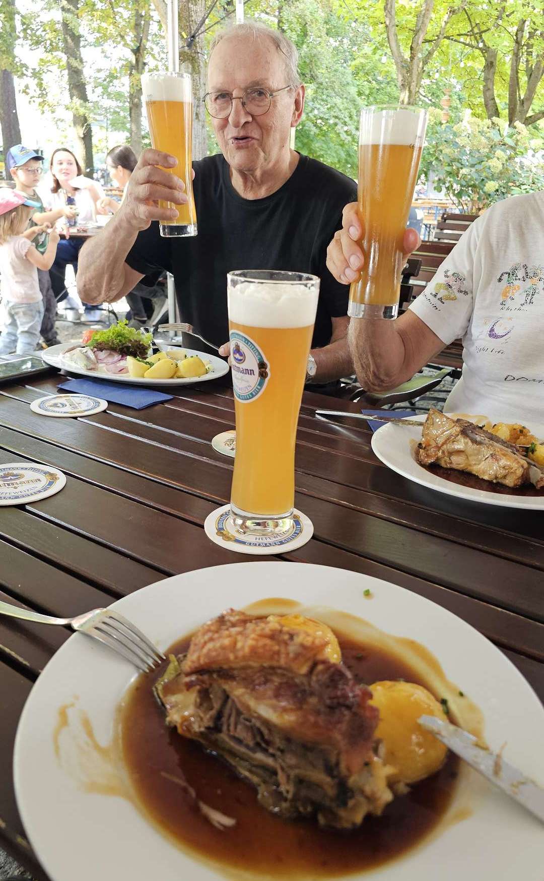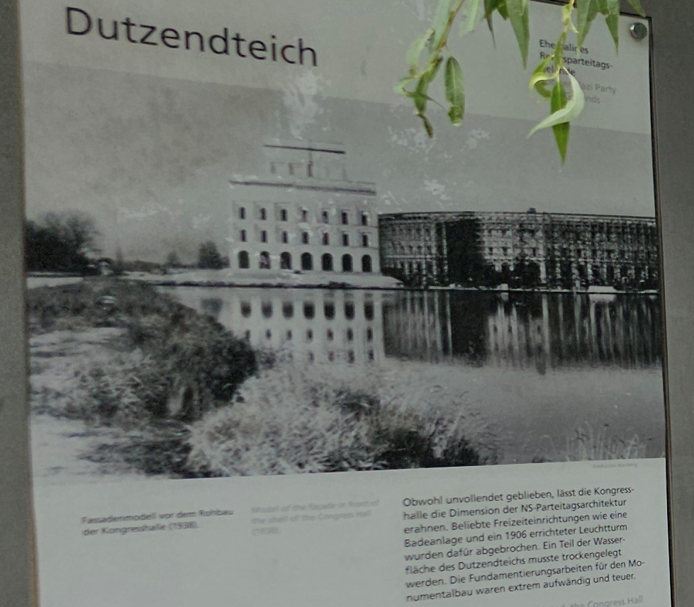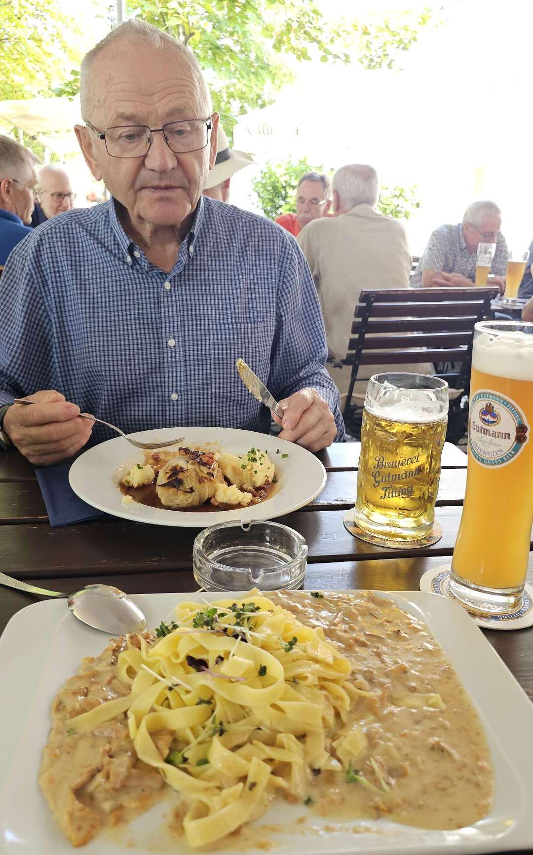 NS-Parteitagsarchitektur sichtbar. Das Gutmann, ein Einkehrort mit langer Geschichte, ist die letzte noch existierende Gaststätte einer ehemals reichen Wirtshauslandschaft am Dutzendteich, mit einem schönen Biergarten mit Blick aufs Wasser. Hier treffen wir Henry wieder; er hat schon einen schattigen Platz reserviert. Bedient werden wir im Eiltempo - so schnell ging es noch nie! Die Speisen kommmen vor den Getränken, das erste Schäuferle so schnell, dass Roland seine Bestellung aufgrund der röschen Kruste noch in selbiges ändern kann 🤣. Nach kurzer Pause geht es