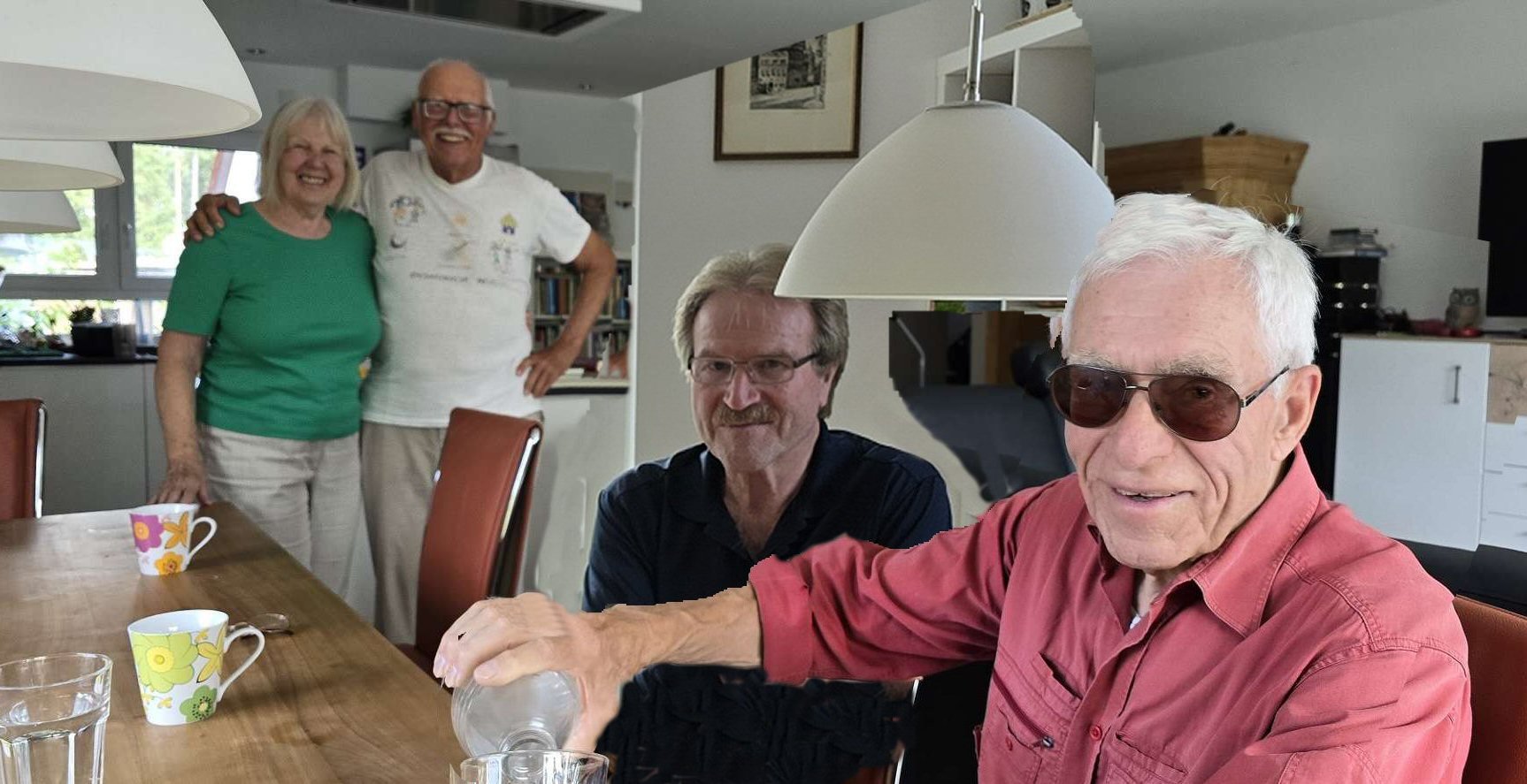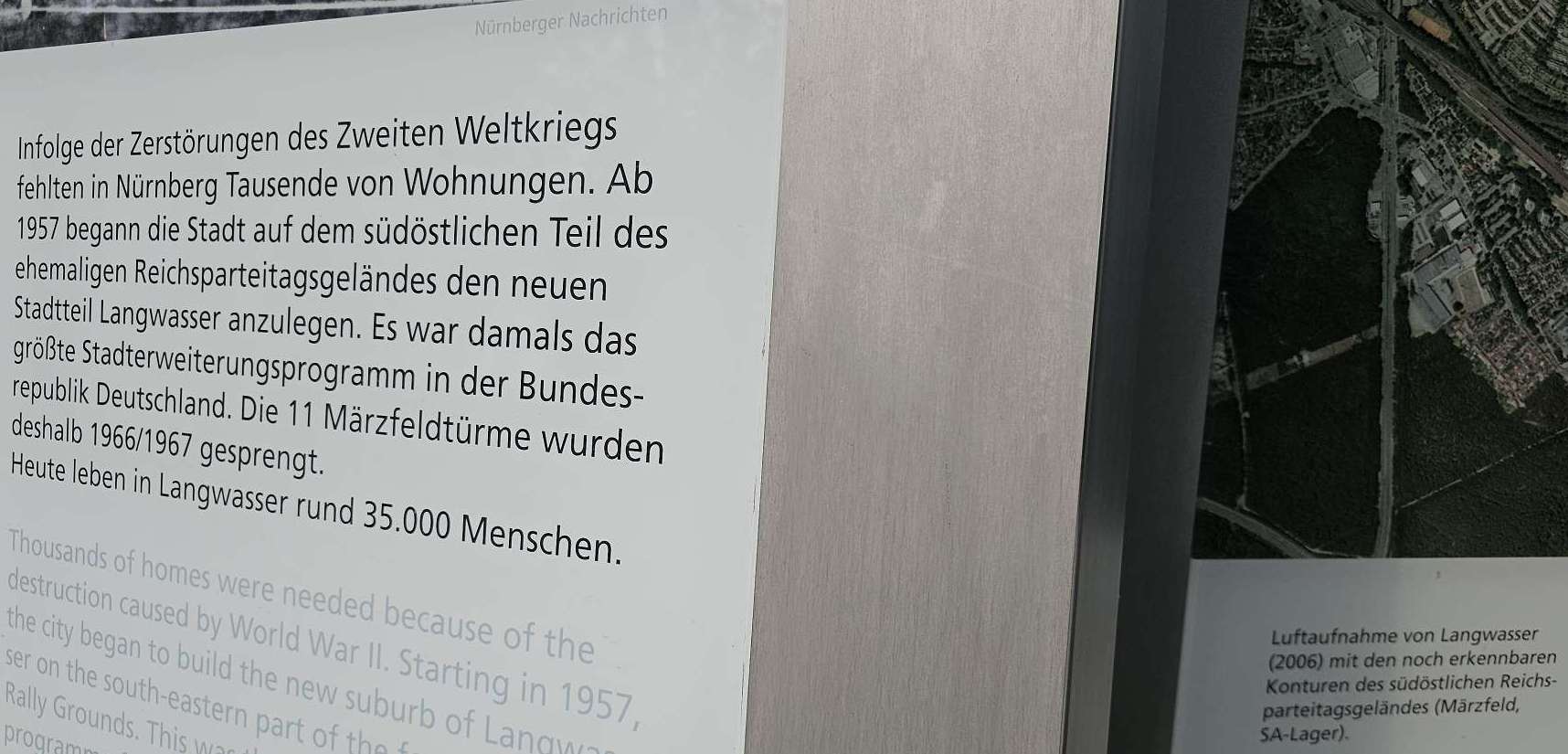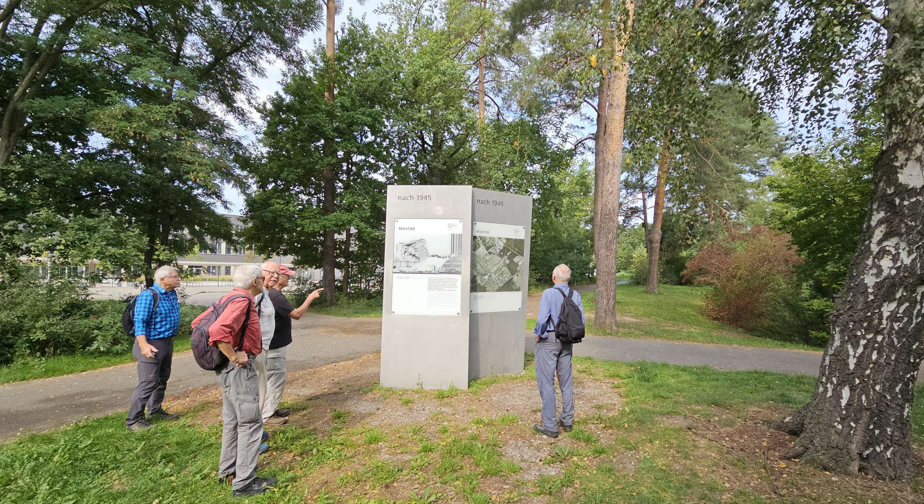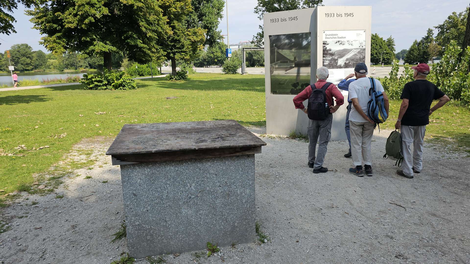 NS-Parteitagsarchitektur sichtbar. Das Gutmann, ein Einkehrort mit langer Geschichte, ist die letzte noch existierende Gaststätte einer ehemals reichen Wirtshauslandschaft am Dutzendteich, mit einem schönen Biergarten mit Blick aufs Wasser. Hier treffen wir Henry wieder; er hat schon einen schattigen Platz reserviert. Bedient werden wir im Eiltempo - so schnell ging es noch nie! Die Speisen kommmen vor den Getränken, das erste Schäuferle so schnell, dass Roland seine Bestellung aufgrund der röschen Kruste noch in selbiges ändern kann 🤣. Nach kurzer Pause geht es