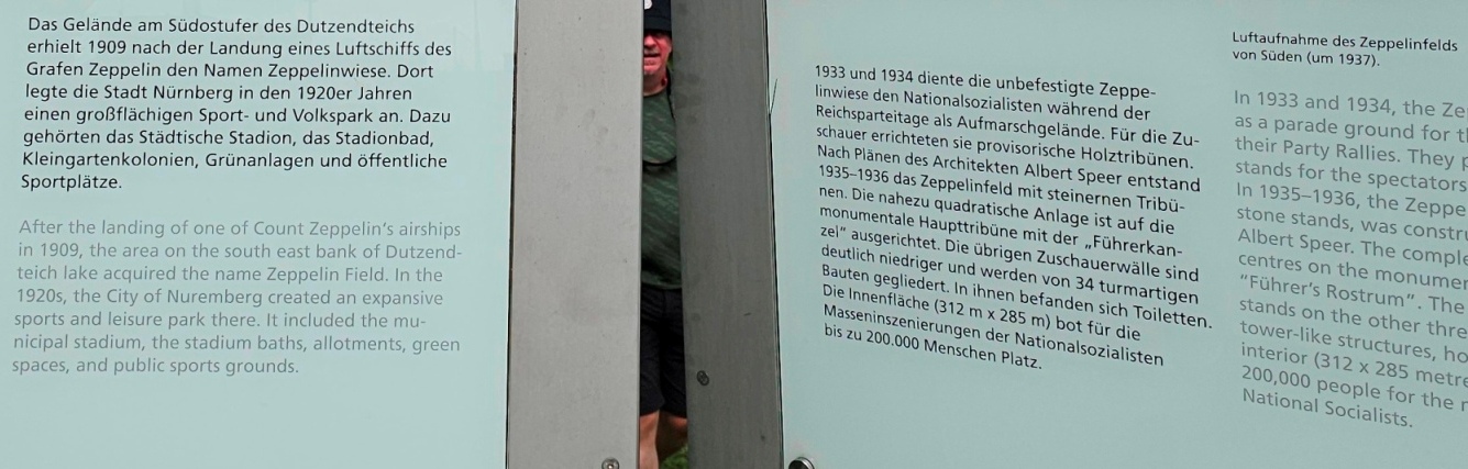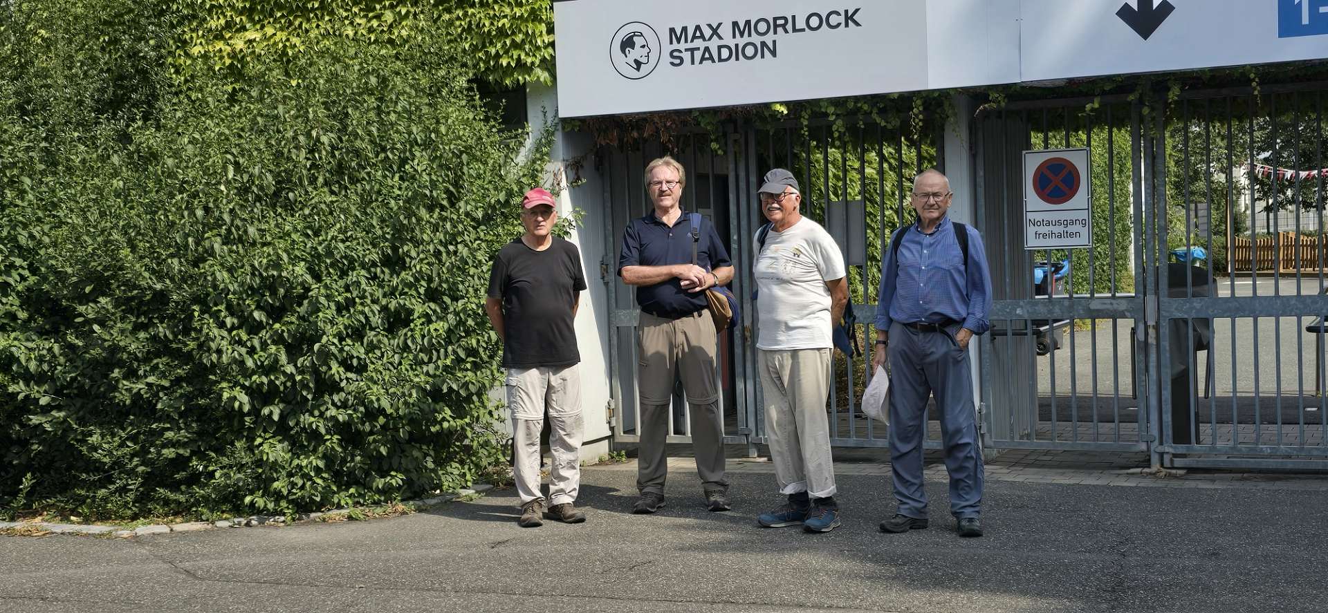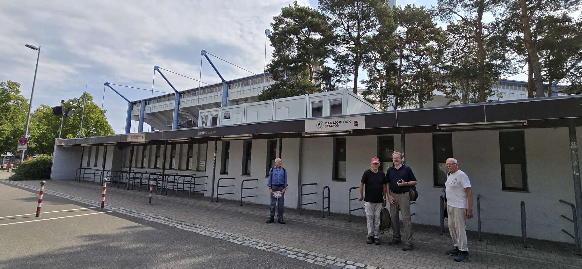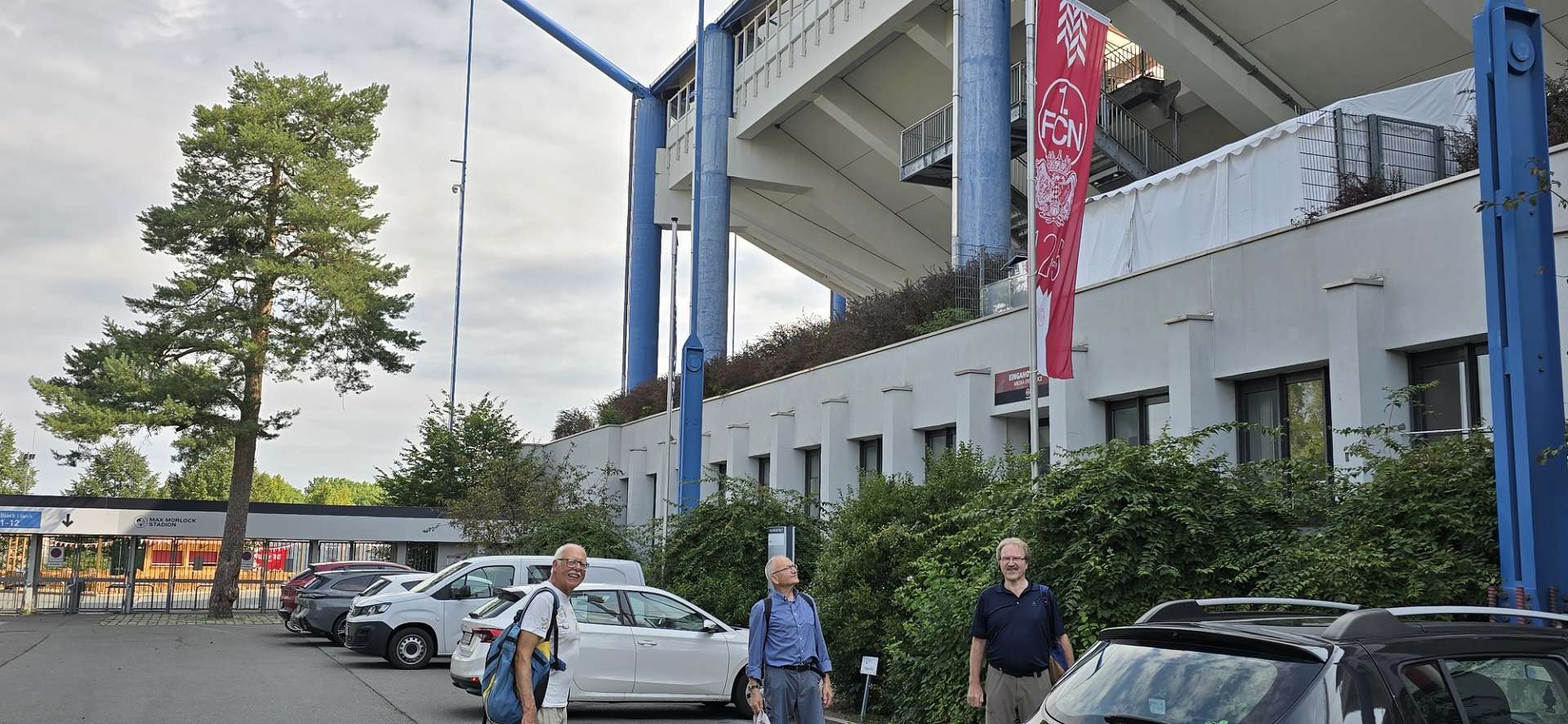 "Deutsche Stadion". Wir überqueren nun wieder die Große Straße: Die zentrale Achse des Geländes, ausgerichtet auf die mittelalterliche Kaiserburg, sollte eine historische Verbindung zum Heiligen Römischen Reich und den Reichstagen in Nürnberg herstellen. Sie war als Aufmarschstraße gedacht, ist zwei Kilometer lang und 40 Meter breit. Südlich wird sie von Tribünenstufen flankiert, wodurch die Breite in diesem Bereich ca. 60 Meter beträgt. Auf einer Betonunterlage verlegte man Granitplatten in zwei verschiedenen Farben, Hell- und Dunkelgrau, damit die dort marschierenden Gruppen leichter die Ausrichtung einhalten konnten. Die hellgrauen, quadratischen Platten haben eine Kantenlänge von 1,2 m, was der Länge von zwei preußischen Stechschritten entspricht. Auch dadurch sollte das Einhalten der Formation bei Paraden erleichtert werden. Bis 1964 diente sie als Start- und Landebahn für die U.S. Army. (Teile aus Wikipedia) Auf der anderen Seite der Großen Straße, der nord-östlichen, geht es wieder weiter in kühlem Laubwald auf gepflegten Wegen > Richtung FCN-Stadion, das wir nach wenigen 100 Metern erreichen. Hier folgt nun eine echte Belastungsprobe für unser Kleeblatt: Foto links, Foto rechts, Foto oben, Foto unten - und Achim wurde zu jeder Aufnahme mitgezerrt. Das Schlimmste für ihn war jedoch ein Borussia-Fan, der extra aus Dortmund angereist ist, um sich unter dem Max-Morlock-Schriftzug fotografieren zu lassen - am Ronhof ist Achim nämlich noch nie ein auswärtiges Nummernschild aufgefallen 😊.