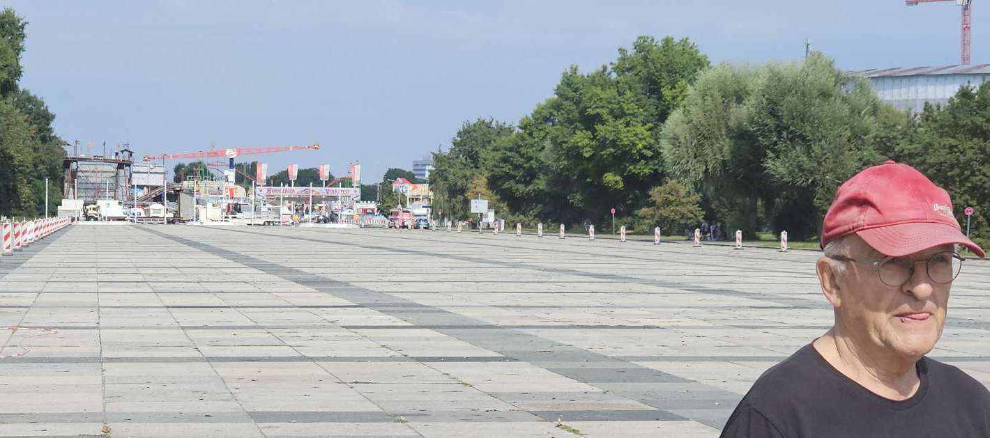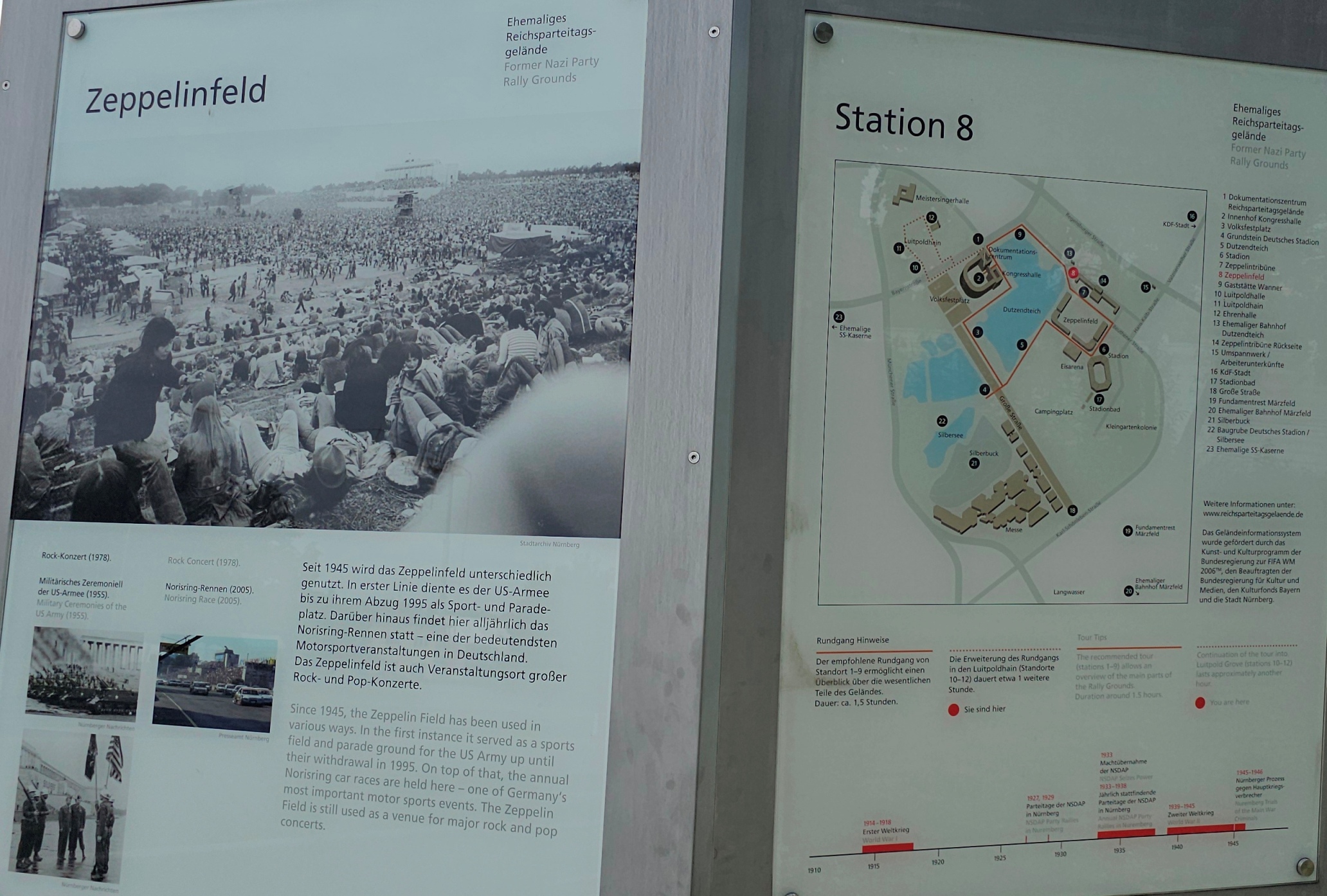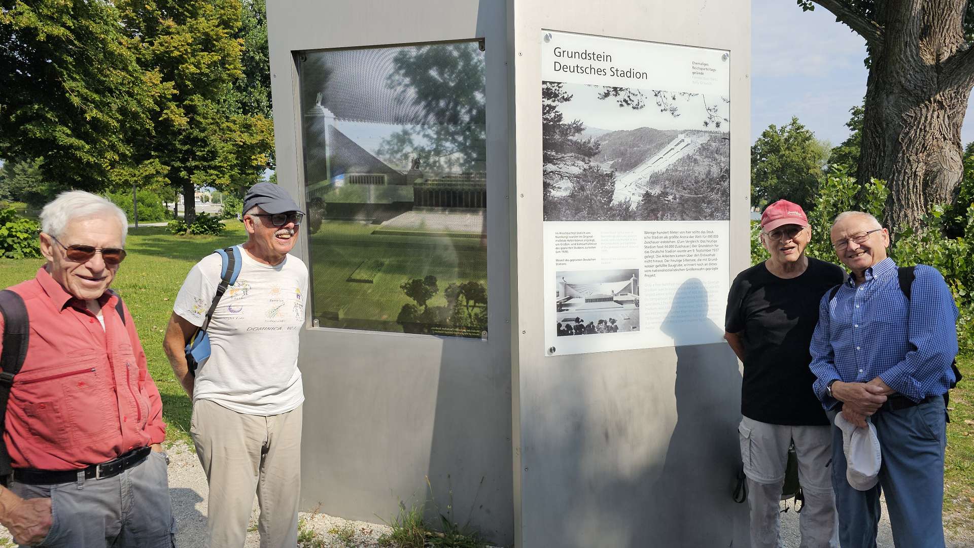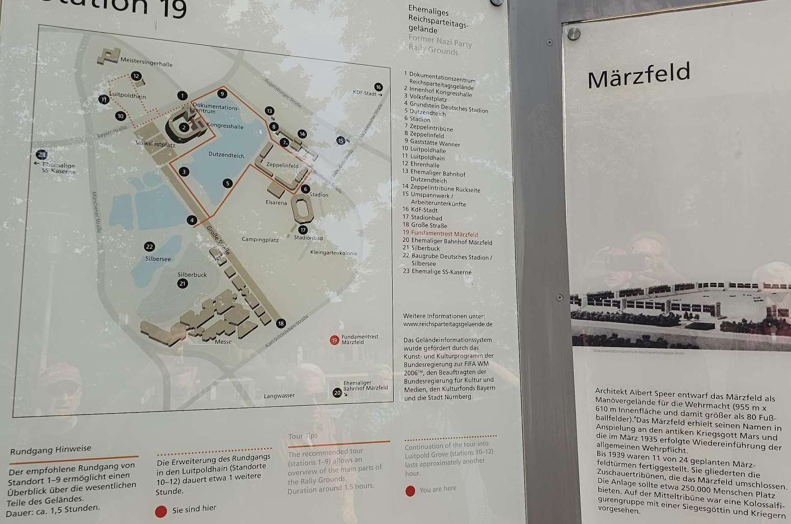 "Deutsche Stadion". Wir überqueren nun wieder die Große Straße: Die zentrale Achse des Geländes, ausgerichtet auf die mittelalterliche Kaiserburg, sollte eine historische Verbindung zum Heiligen Römischen Reich und den Reichstagen in Nürnberg herstellen. Sie war als Aufmarschstraße gedacht, ist zwei Kilometer lang und 40 Meter breit. Südlich wird sie von Tribünenstufen flankiert, wodurch die Breite in diesem Bereich ca. 60 Meter beträgt. Auf einer Betonunterlage verlegte man Granitplatten in zwei verschiedenen Farben, Hell- und Dunkelgrau, damit die dort marschierenden Gruppen leichter die Ausrichtung einhalten konnten. Die hellgrauen, quadratischen Platten haben eine Kantenlänge von 1,2 m, was der Länge von zwei preußischen Stechschritten entspricht. Auch dadurch sollte das Einhalten der Formation bei Paraden erleichtert werden. Bis 1964 diente sie als Start- und Landebahn für die U.S. Army. (Teile aus Wikipedia) Auf der anderen Seite der Großen Straße, der nord-östlichen, geht es wieder weiter in kühlem Laubwald auf gepflegten Wegen > Richtung FCN-Stadion, das wir nach wenigen 100 Metern erreichen. Hier folgt nun eine echte Belastungsprobe für unser Kleeblatt: Foto links, Foto rechts, Foto oben, Foto unten - und Achim wurde zu jeder Aufnahme mitgezerrt. Das Schlimmste für ihn war jedoch ein Borussia-Fan, der extra aus Dortmund angereist ist, um sich unter dem Max-Morlock-Schriftzug fotografieren zu lassen - am Ronhof ist Achim nämlich noch nie ein auswärtiges Nummernschild aufgefallen 😊.
