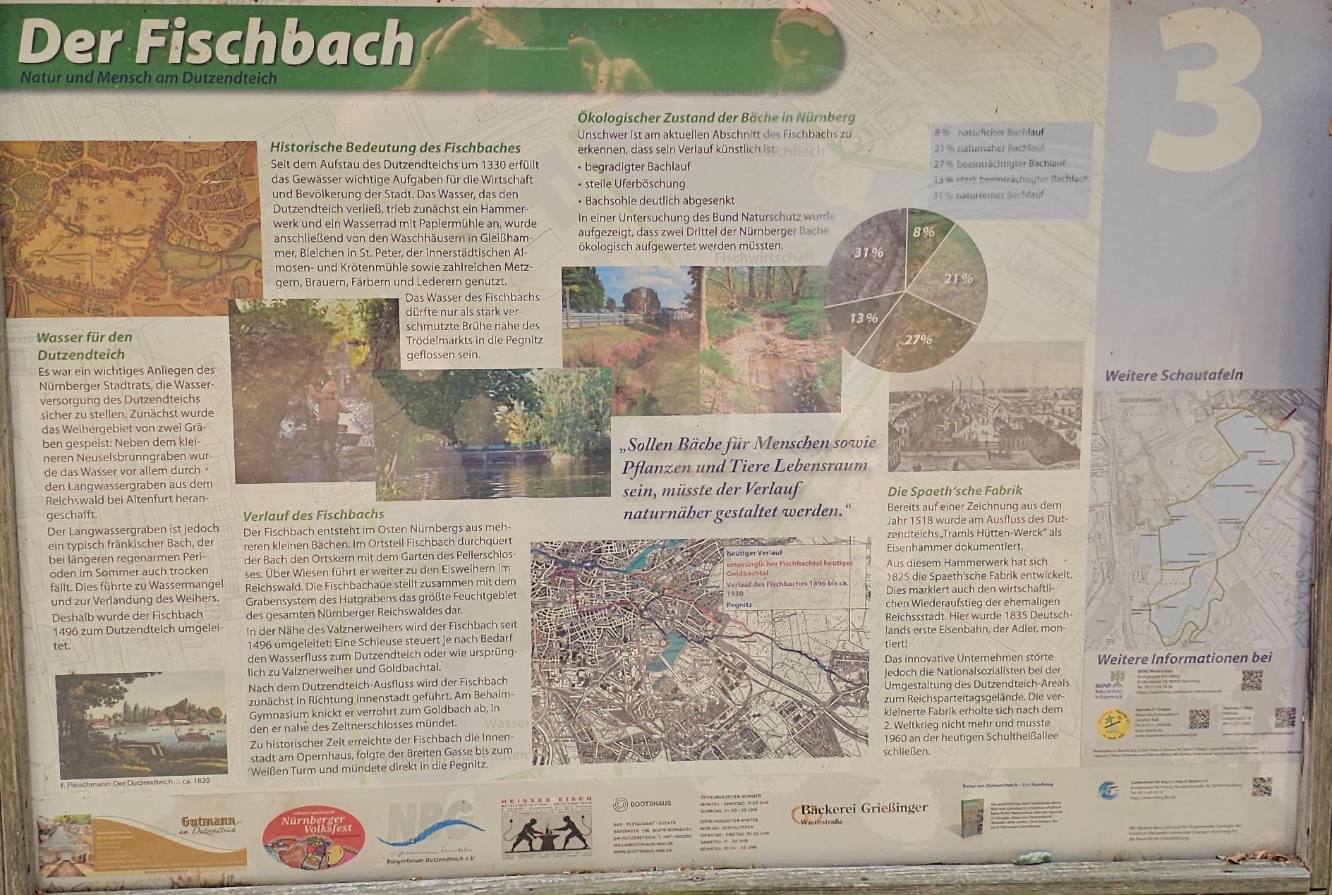 der "Arena". Der große und der kleine Dutzendteich werden vom Fischbach durchflossen und vom Langwasser gespeist. Im Winter kann man Schlittschuhlaufen, im Herbst wird das Wasser komplett abgelassen da der große Teich auch als Karpfenweiher dient.Der Name Dutzendteich kommt übrigens nicht etwa von ehemals vorhandenen zwölf Teichen (es waren nur acht). Einige Quellen besagen, dass sich der Name von der altdeutschen Bezeichnung Doutze für Schilfrohr ableitet, und, u.a. der „Pfinzing-Atlas“ von 1594 vermutet, die Bezeichnung Tutschetey, was schlammiges Gelände bedeutet, als Ursprung. Heute liegt neben dem großen Dutzendteich (früher auch „Dutzenteich“ geschrieben) der wg. des Baus der Großen Straße abgetrennte kleine Dutzendteich (Flachweiher) und weitere kleinere Weiher, die als „Nummernweiher“ bezeichnet werden. Von den ursprünglich vier Nummernweihern sind nur noch zwei erhalten. (Teilweise Wikipedia).