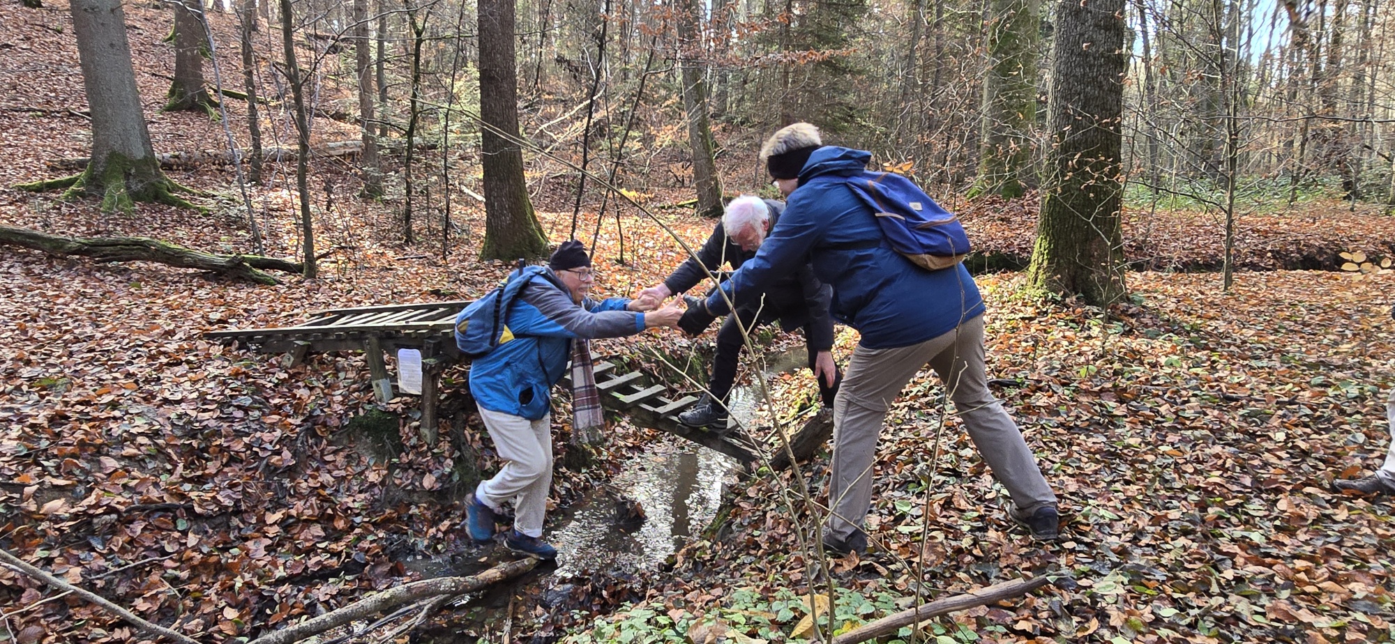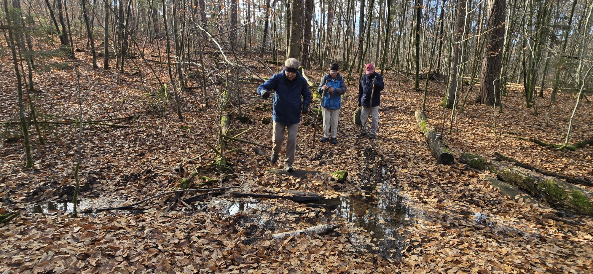 auszuweichen, durch den der Trampelpfad führt. Als wir dann am Landgasthof Meisel ankommen ist auch der von einigen angedachte Punkteabzug für die Planung vergessen. Und nachdem uns die Bedienung, ob unserer Selbstständigkeit beim Tische- und Stühlerücken, zurechtgestutzt hat, wir aber sehr zufrieden mit Speisen und Getränken sind, machen wir uns gut gelaunt auf den Heimweg. |