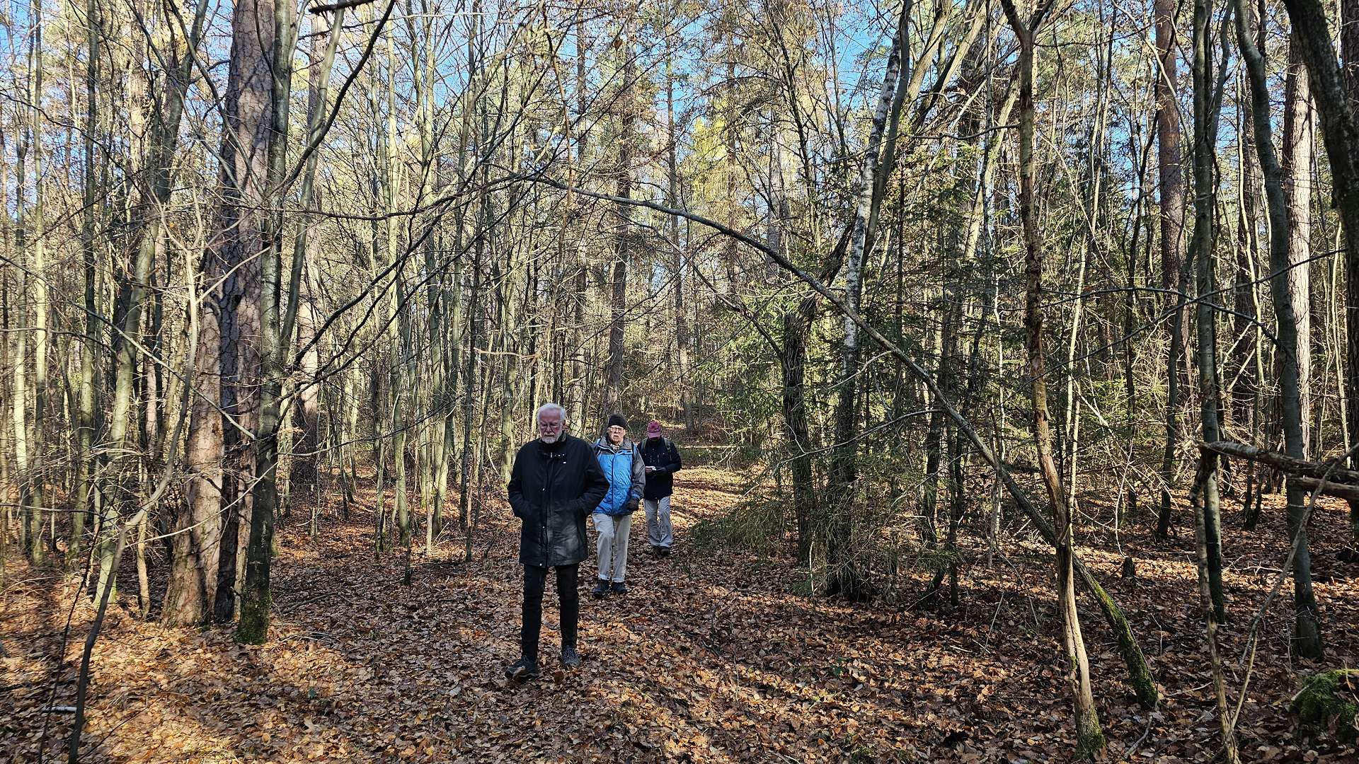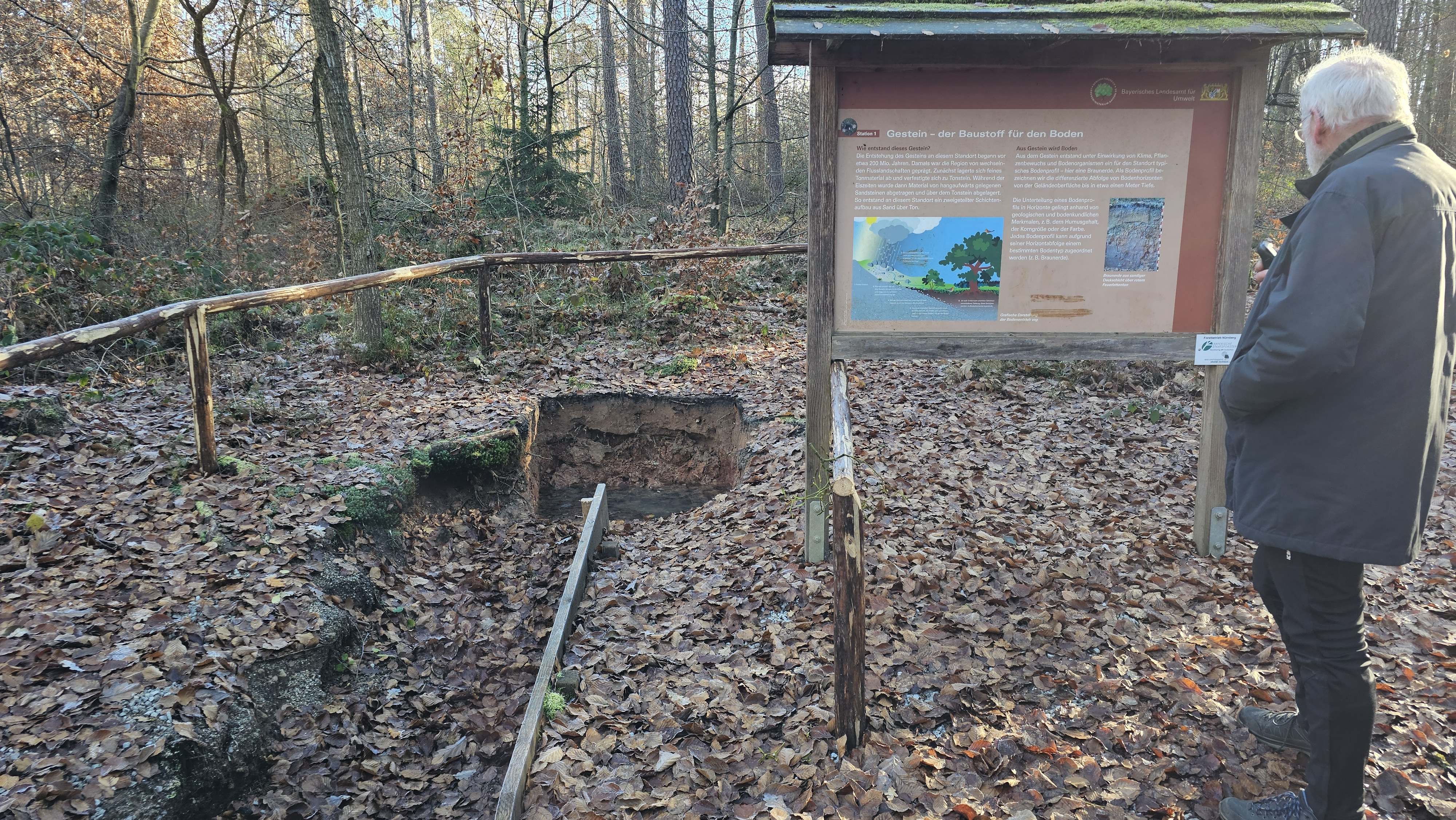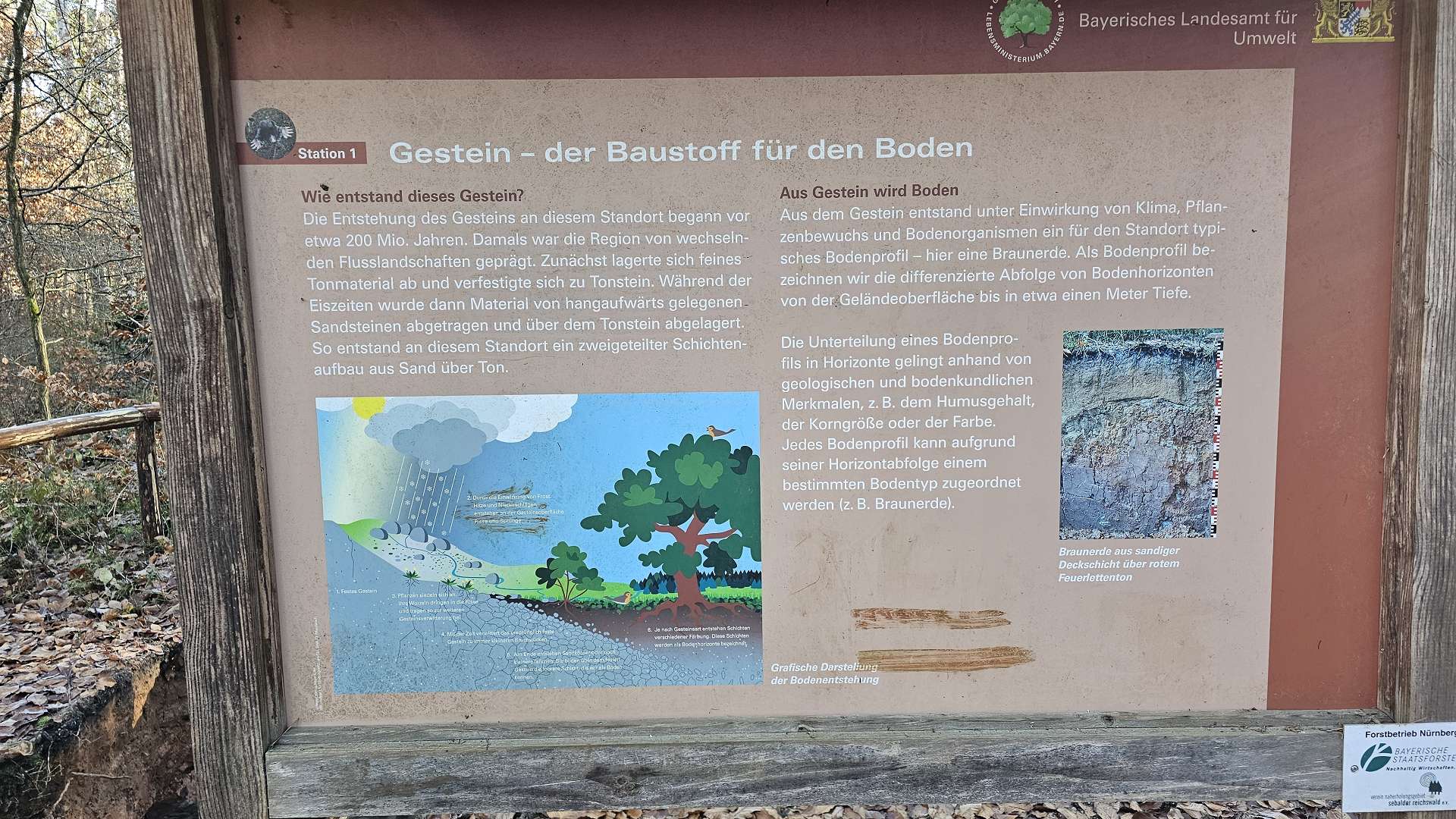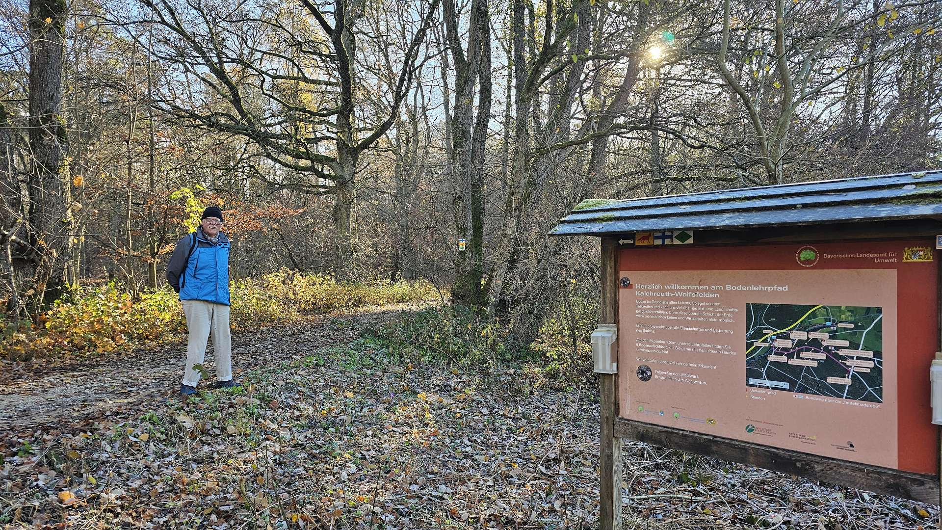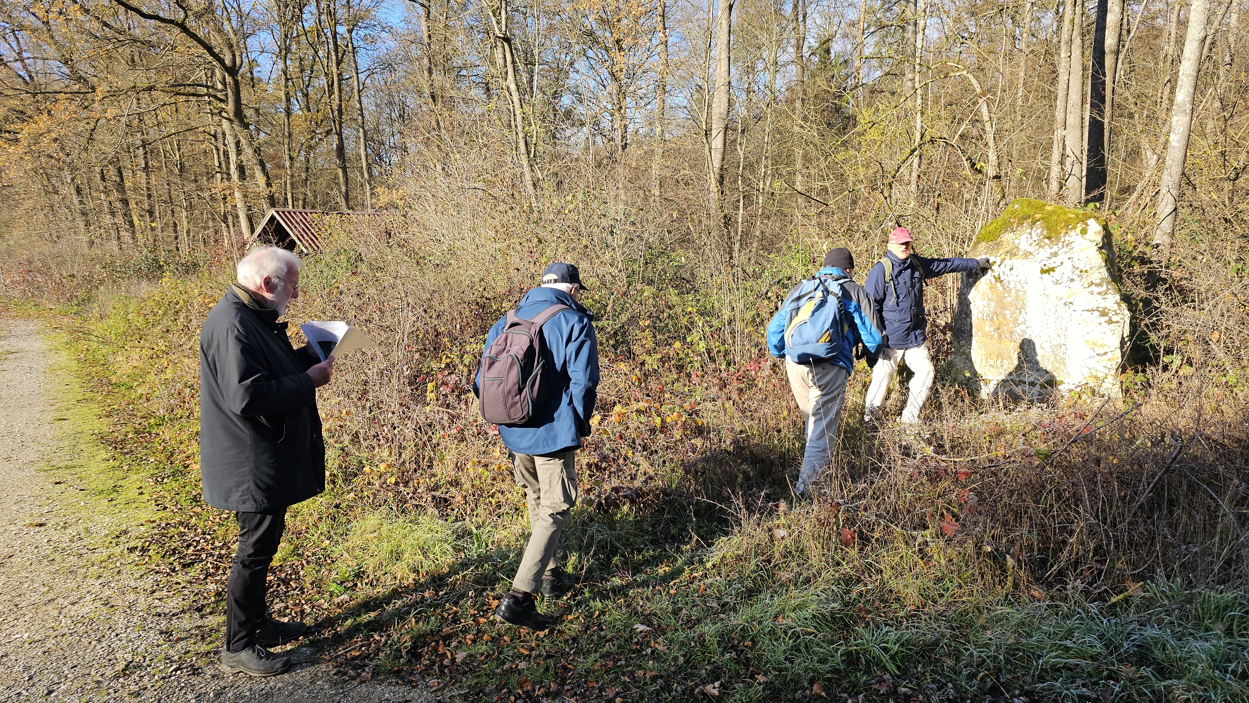 (Keuper) gegraben hat. Am dortigen Gedenkstein genießen wir wieder die warme Sonne, während Karsten etwas über die Geschichte des Weilers Wolfsfelden (mehr) und die aktuelle Nutzung der Wiese vorträgt: Der Weiler entstand um die Jahrtausendwende, war lange im Besitz Nürnberger Patrizierfamilien. Es lebten bis zu 100 Personen hier, es gab ein Wirtshaus, in dem irgendwann aber "Gesindel und Wilddiebe" ein und aus gingen. Gegen Ende des 19. Jh. erwarb die Forstverwaltung den Weiler, die Gebäude wurden abgerissen und die Fläche bis auf die Wiese aufgeforstet. Ob der Name von einem Besitzer Namens Wolf oder vom gleichnamigen Tier abgeleitet wurde, ist nicht bekannt. Da wir einen Termin haben