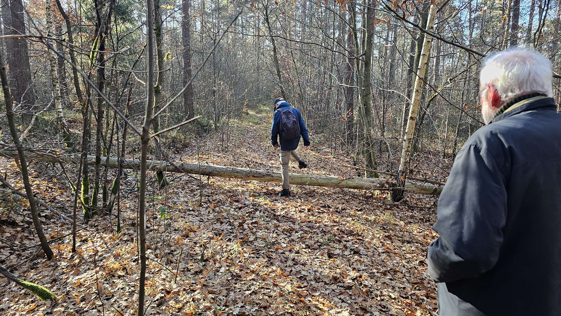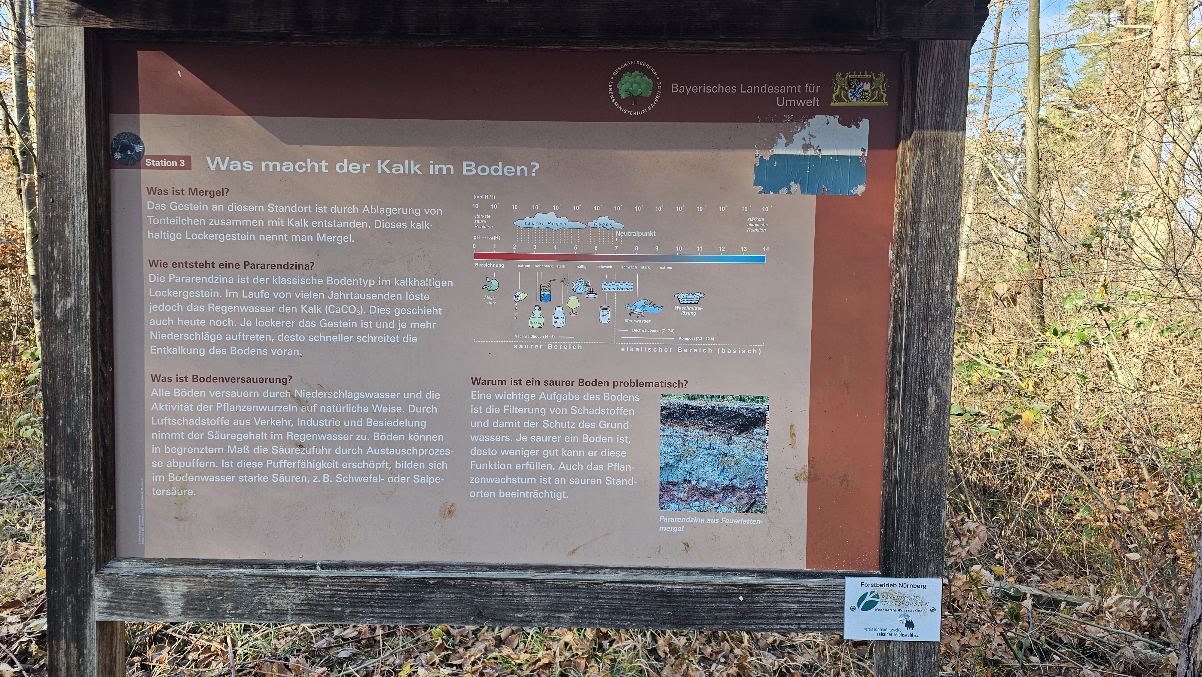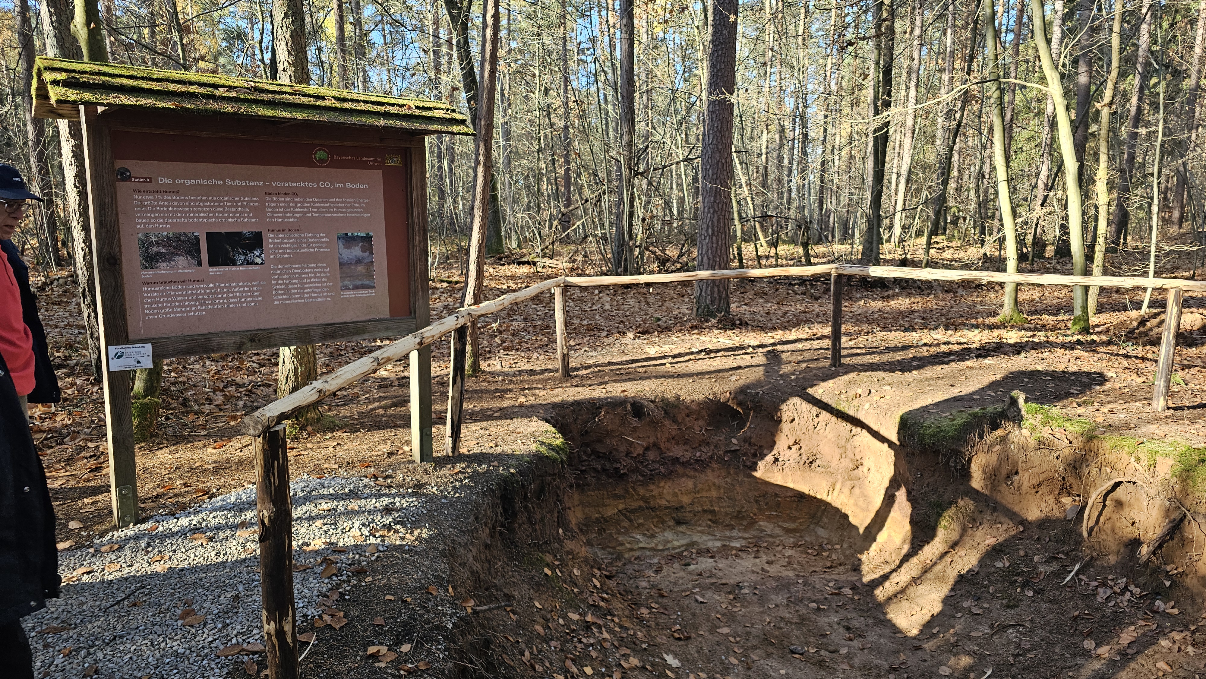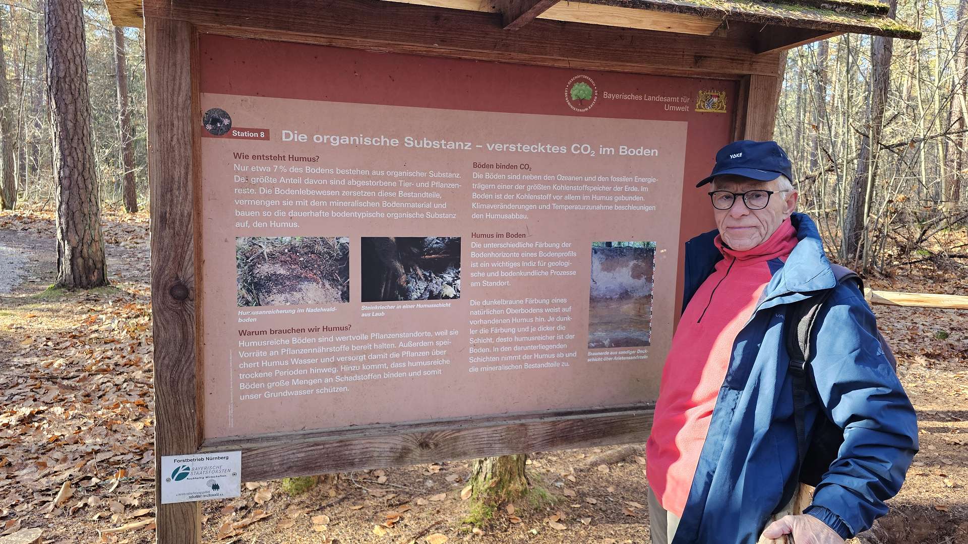 (Keuper) gegraben hat. Am dortigen Gedenkstein genießen wir wieder die warme Sonne, während Karsten etwas über die Geschichte des Weilers Wolfsfelden (mehr) und die aktuelle Nutzung der Wiese vorträgt: Der Weiler entstand um die Jahrtausendwende, war lange im Besitz Nürnberger Patrizierfamilien. Es lebten bis zu 100 Personen hier, es gab ein Wirtshaus, in dem irgendwann aber "Gesindel und Wilddiebe" ein und aus gingen. Gegen Ende des 19. Jh. erwarb die Forstverwaltung den Weiler, die Gebäude wurden abgerissen und die Fläche bis auf die Wiese aufgeforstet. Ob der Name von einem Besitzer Namens Wolf oder vom gleichnamigen Tier abgeleitet wurde, ist nicht bekannt. Da wir einen Termin haben