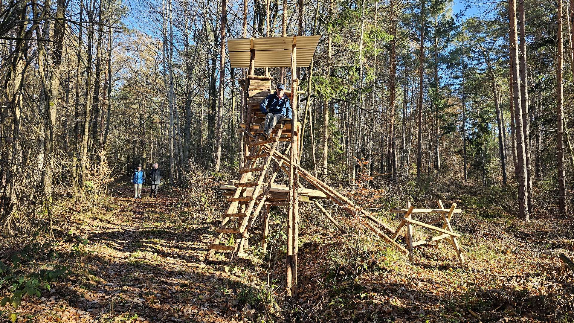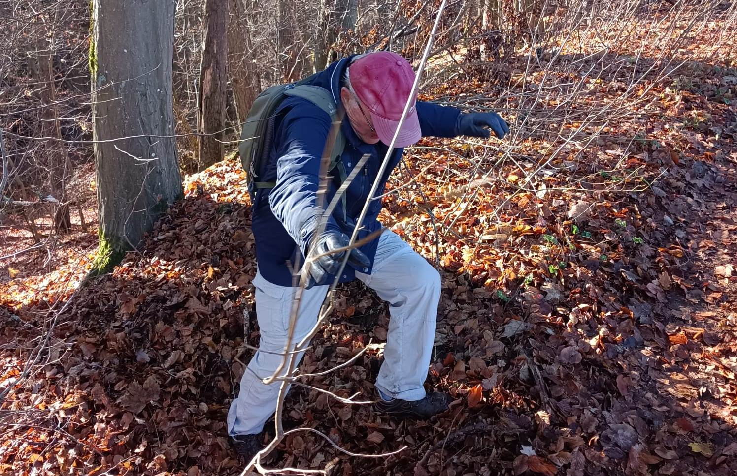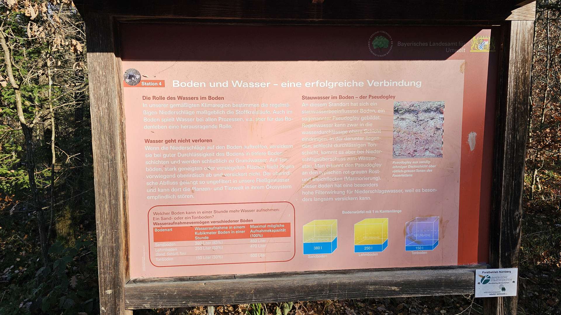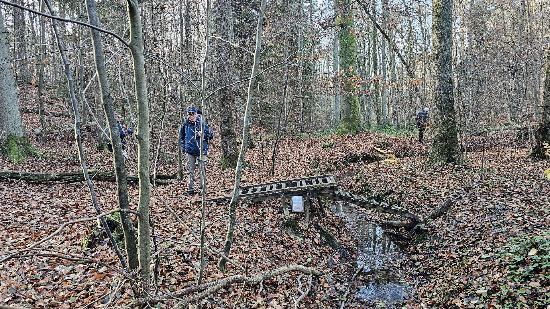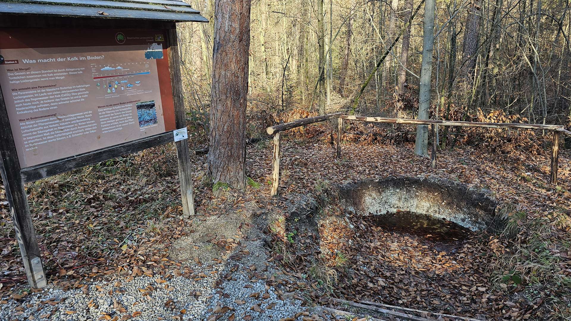 (Keuper) gegraben hat. Am dortigen Gedenkstein genießen wir wieder die warme Sonne, während Karsten etwas über die Geschichte des Weilers Wolfsfelden (mehr) und die aktuelle Nutzung der Wiese vorträgt: Der Weiler entstand um die Jahrtausendwende, war lange im Besitz Nürnberger Patrizierfamilien. Es lebten bis zu 100 Personen hier, es gab ein Wirtshaus, in dem irgendwann aber "Gesindel und Wilddiebe" ein und aus gingen. Gegen Ende des 19. Jh. erwarb die Forstverwaltung den Weiler, die Gebäude wurden abgerissen und die Fläche bis auf die Wiese aufgeforstet. Ob der Name von einem Besitzer Namens Wolf oder vom gleichnamigen Tier abgeleitet wurde, ist nicht bekannt. Da wir einen Termin haben