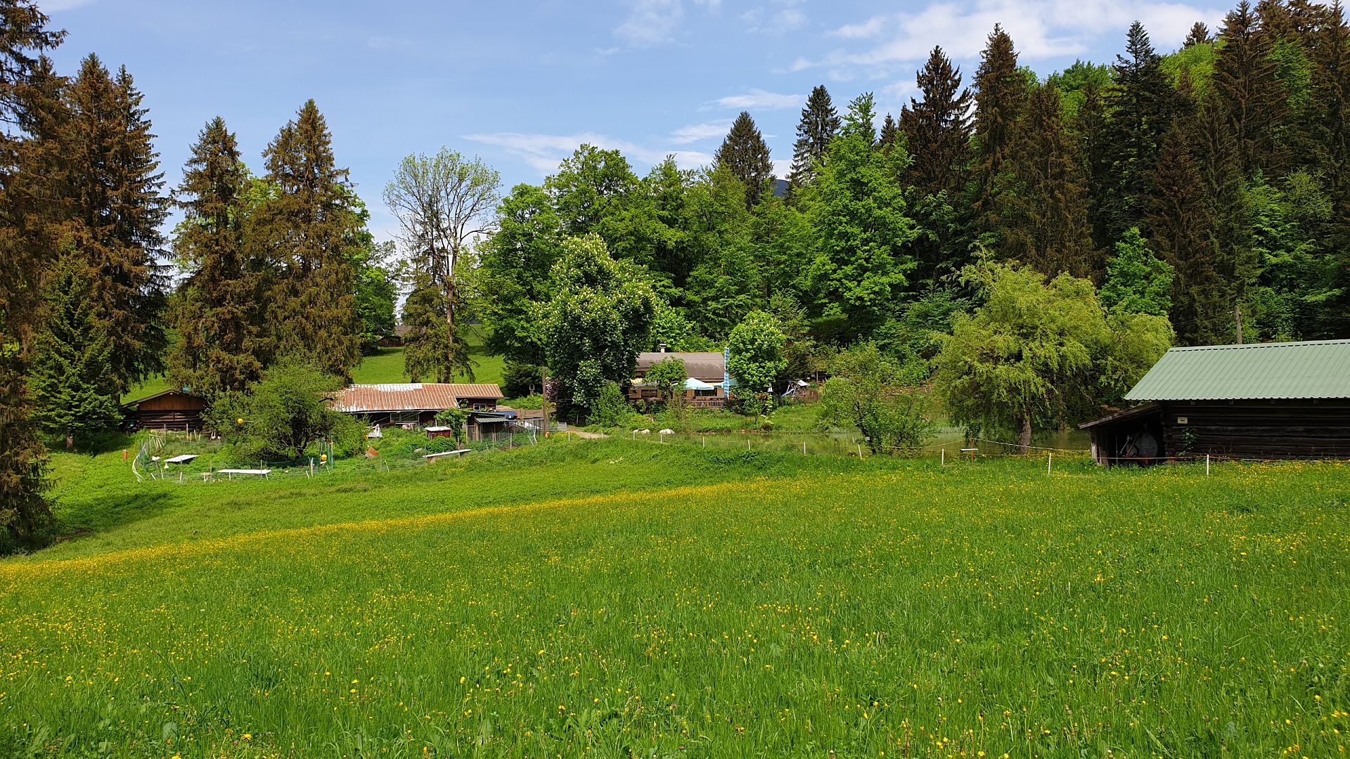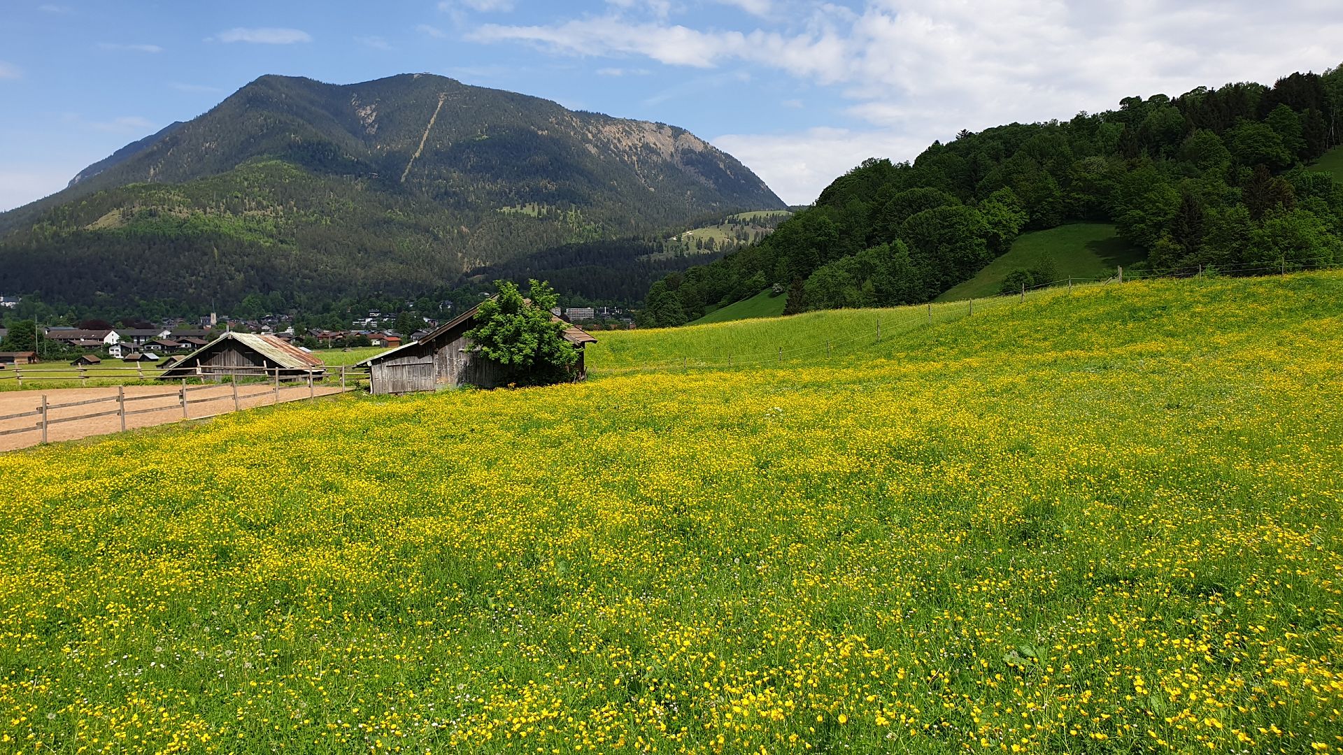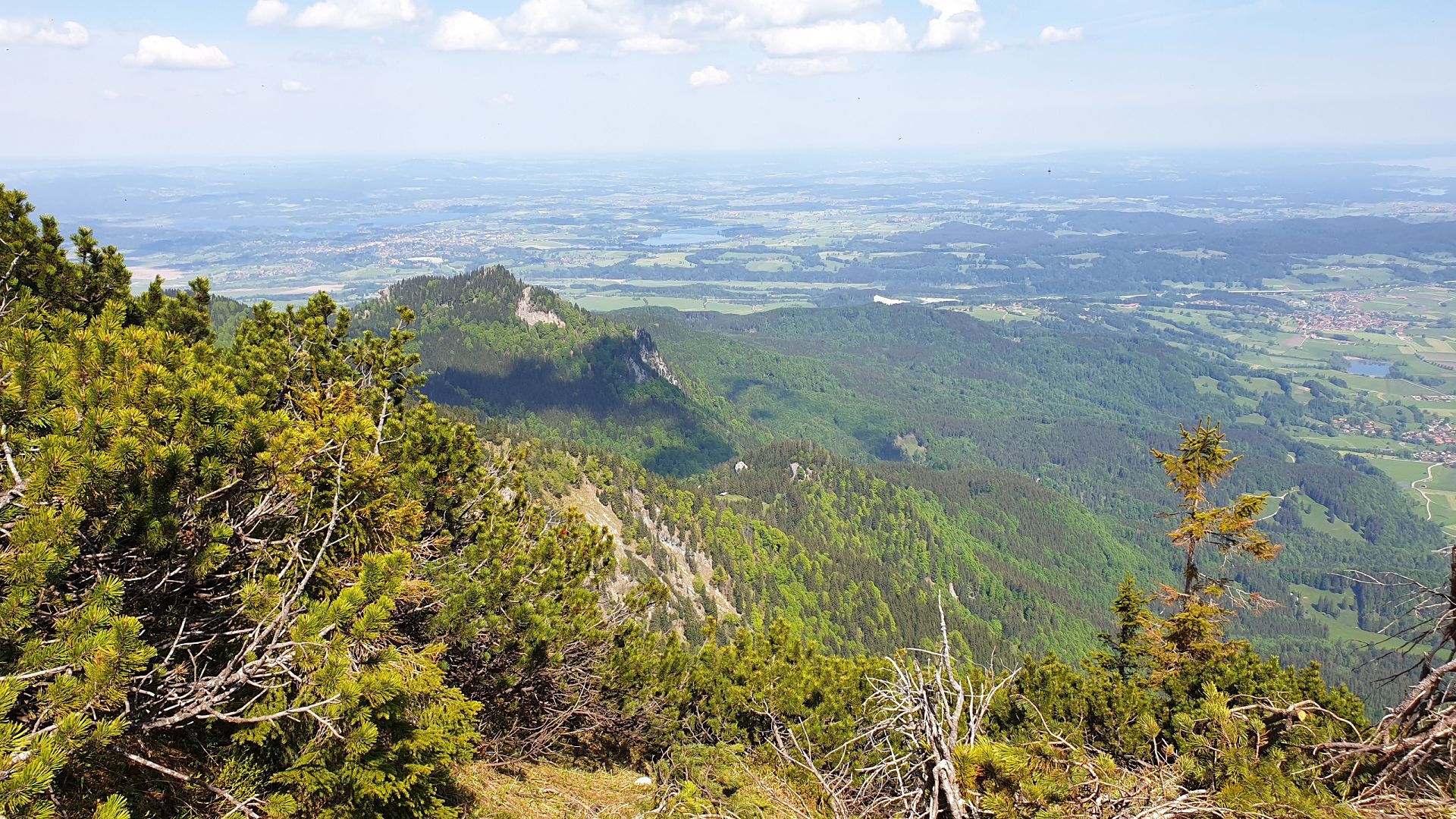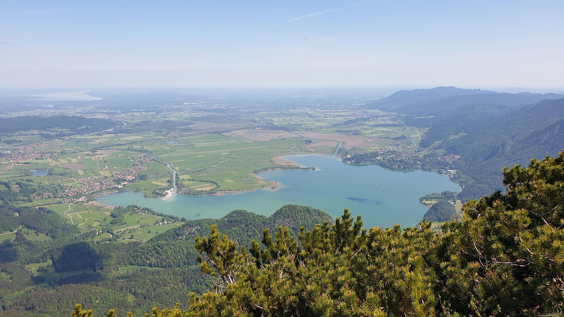unten: schöner Blick von der (zu teuren) Kreut-Alm nach Schlehdorf und Kochelsee