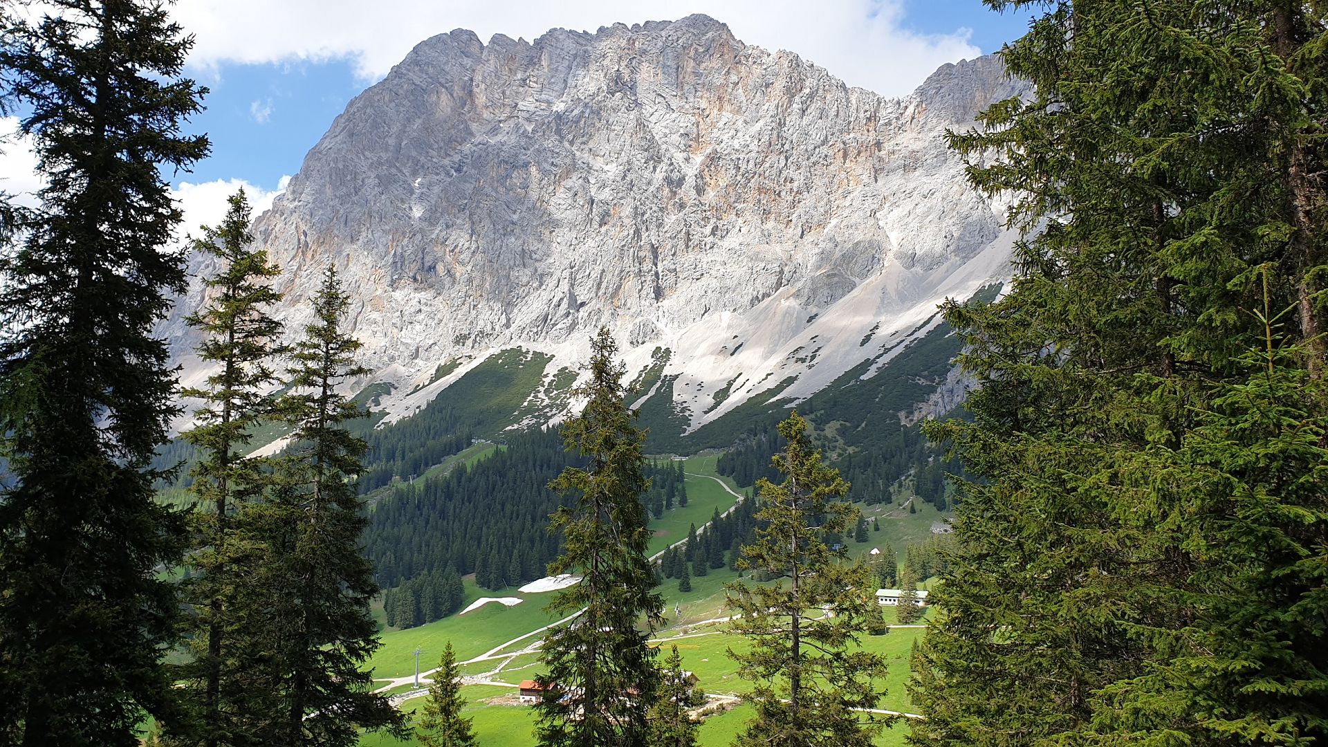 oben: Seebensee-Alm, dahinter der Schneefernerkopf, links dahinter die Zugspitze