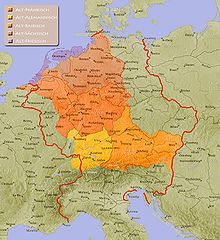 Die kontinental-westgermanische Sprachregion ohne Langobardisch, z. Z. des Übergangs vom Ostfranken- zum Heilign Römischen Reich ~962 |